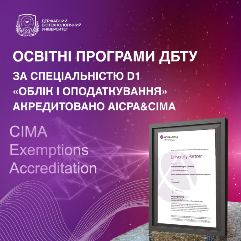Державний біотехнологічний університет отримав підтвердження статусу Університету-Партнера AICPA&CIMA, що об’єднує Асоціацію Американського інституту сертифікованих публічних…