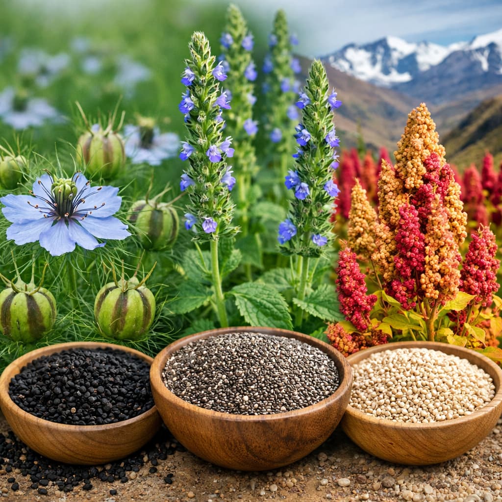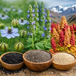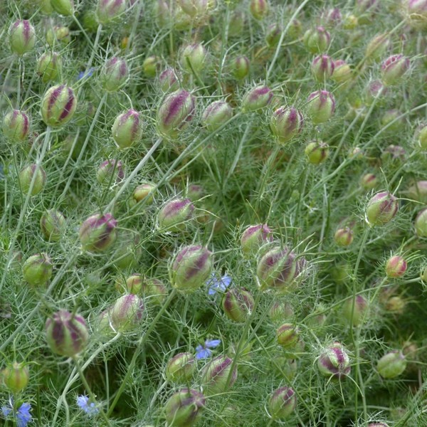 На фото представлена нігела (Nigella damascena L.) — ефіроолійна нішова культура, насіння якої містить цінні біологічно активні речовини та використовується у харчуванні й фармацевтиці. Рослина характеризується декоративними квітками та капсулами з чорним насінням і добре адаптується до різних ґрунтово-кліматичних умов