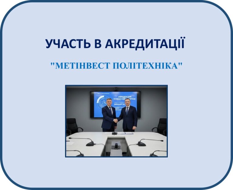 Участь завідувача кафедри Мірошника О.О. в акредитації освітньої програми на першому рівні вищої освіти «Бакалавр» за спеціальністю 141 Електроенергетика, електротехніка та електромеханіка у закладі вищої освіти ТОВАРИСТВО З ОБМЕЖЕНОЮ ВІДПОВІДАЛЬНІСТЮ “ТЕХНІЧНИЙ УНІВЕРСИТЕТ “МЕТІНВЕСТ ПОЛІТЕХНІКА”