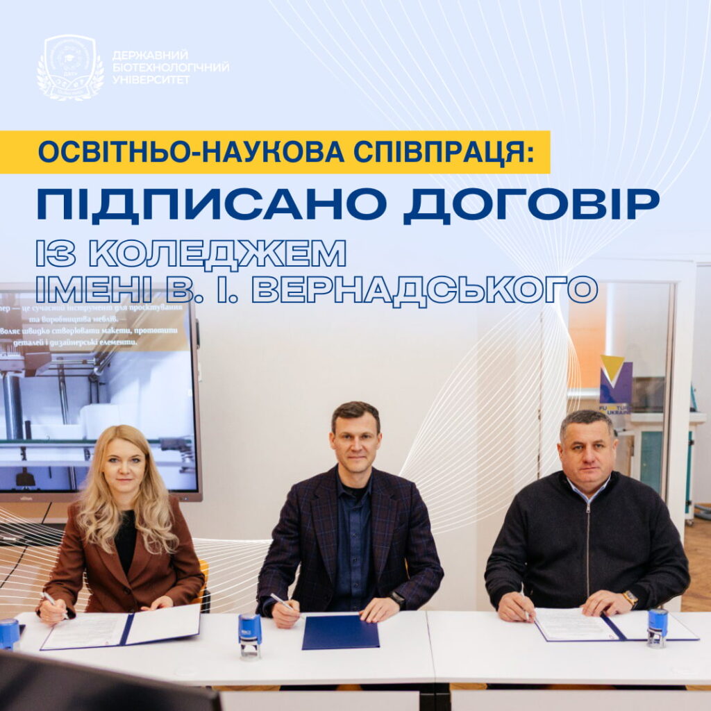 На базі Державного біотехнологічного університету підписано договір про співпрацю в освітньо-науковій діяльності з Харківським державним професійно-педагогічним фаховим коледжом імені В. І. Вернадського. Укладена угода розширює можливості партнерства у підготовці здобувачів…