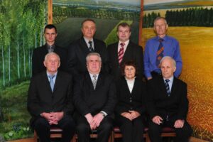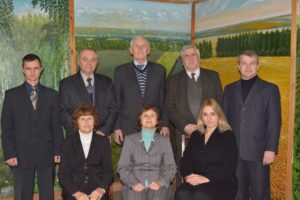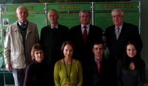 Нижній ряд: к.с.-г.н., доц. Андрущенко О.П.; д.с.-г.н., проф. Лохматов М.А.; к.с.-г.н., доц. Ткач Л.І.; к.с.-г.н., доц., заступник голови Державного комітету лісового господарства України, завідувач кафедри Ведмідь М.М.; д.с.-г.н., проф. Поляков В.О.