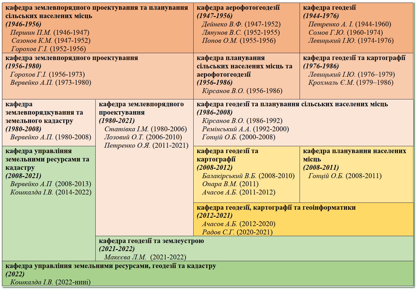 Підготовка здобувачів за спеціальністю «Геодезія та землеустрій» має багаторічну історію, що бере початок у 1944 році в Харківському сільськогосподарському інституті зі створення кафедри землевпорядного проєктування та планування сільських населених пунктів.Саме тоді було закладено основу першої в Україні науковометодичної школи землевпорядкування і започатковано системну підготовку інженерівземлевпорядників – першими в Україні. Упродовж наступних десятиліть кафедра послідовно розвивалася, зміцнюючи наукові традиції, оновлюючи зміст навчання та розширюючи партнерства з виробництвом і науковими центрами України та світу.