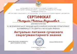 - Договір про співпрацю між факультетом менеджменту, адміністрування та права Державного біотехнологічного університету та адвокатом Яною Сивовою від 13.11.2024 р.