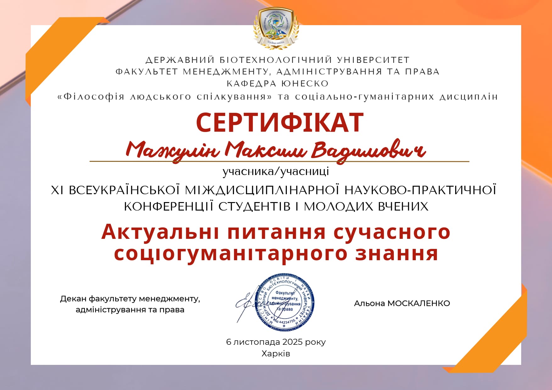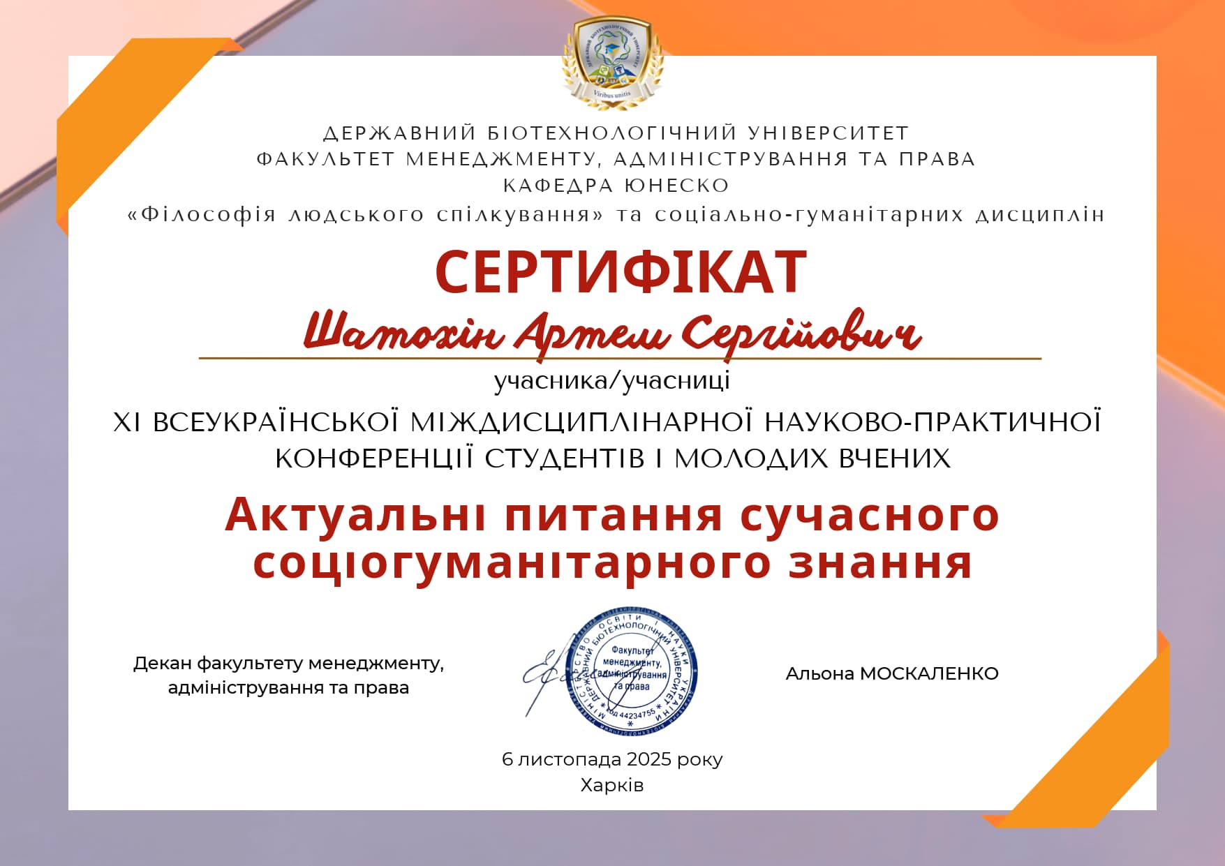 - Договір про співпрацю між факультетом менеджменту, адміністрування та права Державного біотехнологічного університету та адвокатом Яною Сивовою від 13.11.2024 р.