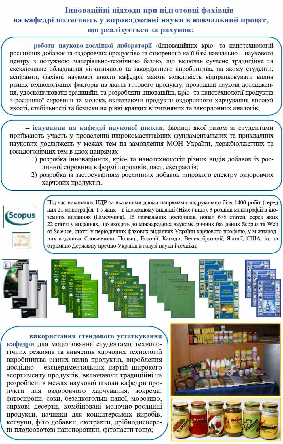 Відповідно задуму засновника кафедри, проф. Павлюк Р.Ю., відмінністю підготовки фахівців на випусковій кафедрі з моменту створення було застосування інноваційних підходів світового рівня і класу. Вони полягали у впровадженні результатів НДР в навчальний процес за рахунок викладання авторських курсів дисциплін проф. Павлюк Р.Ю., які були складені на основі результатів багаторічних НДР наукової школи кафедри та відображені в 15 монографіях, що використовувались як навчальні посібники. Два з авторських курсів, «Нові продукти оздоровчого харчування», «Товарознавство лікарсько-технічної рослинної сировини», викладались студентам товарознавчого факультету понад 20 років. Інноваційні підходи також включали залучення студентів, починаючи з 1 курсу, до участі в НДР кафедри за актуальною науковою тематикою; популяризацію результатів НДР фахівців наукової школи кафедри отриманих під час виконання дисертаційних робіт в формі яскравих постерних доповідей; проведення практики студентів у новому форматі із застосуванням експериментальної бази кафедри; проведення майстер-класів з молекулярних технологій з використанням рідкого азоту під час лабораторних занять, що включали вивчення інноваційних технологій галузі, під час проведення профорієнтаційної роботи та ін.
