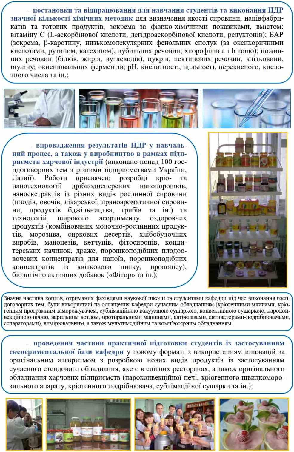 В лабораторіях кафедри поставлена значна кількість стандартних та оригінальних методів і методик досліджень якості сировини, напівфабрикатів та готових продуктів з рослинної сировини та молока, що застосовується викладачами, студентами та аспірантами кафедри в навчальній та науковій роботі.