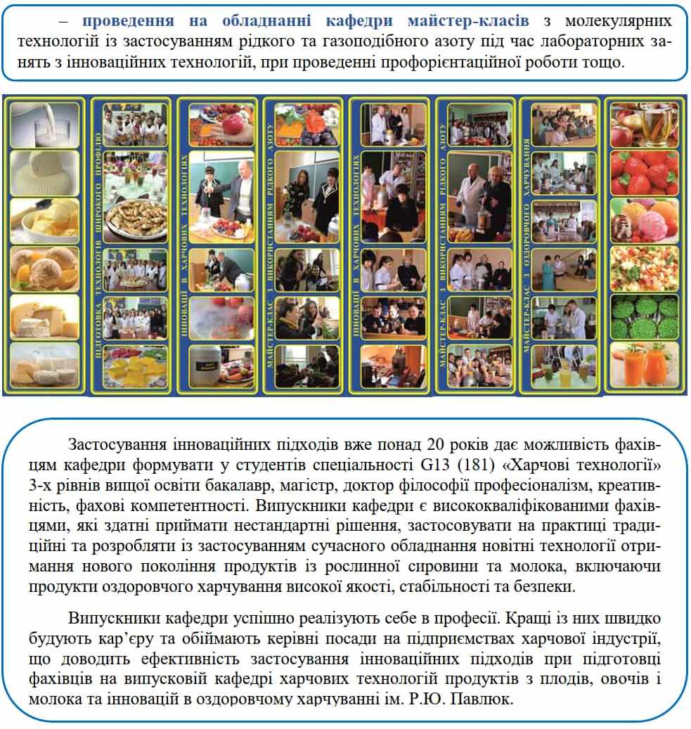 Застосування інноваційних підходів вже понад 20 років дає можливість фахівцям кафедри формувати у студентів спеціальності G13 (181) «Харчові технології» 3-х рівнів вищої освіти бакалавр, магістр, доктор філософії професіоналізм, креативність, фахові компетентності. Випускники кафедри затребувані на ринку праці. Кращі із них швидко реалізують себе в професії та обіймають керівні посади на підприємствах харчової індустрії, що доводить ефективність застосування інноваційних підходів при підготовці здобувачів на випусковій кафедрі харчових технологій продуктів з плодів, овочів і молока та інновацій в оздоровчому харчуванні ім. Р.Ю. Павлюк.