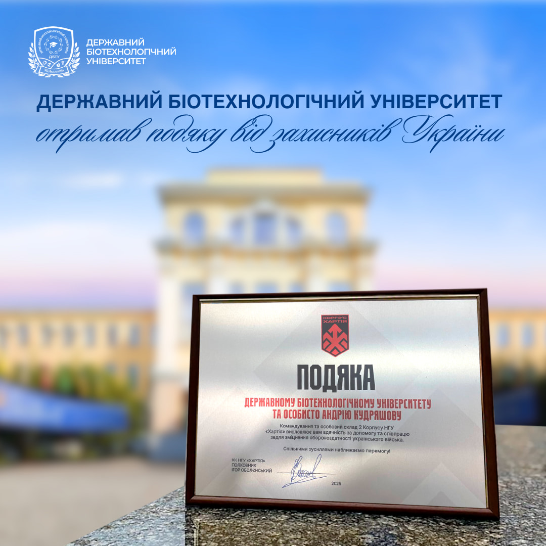 Державний біотехнологічний університет отримав подяку від командування та бійців корпусу Національної гвардії України «Хартія».
