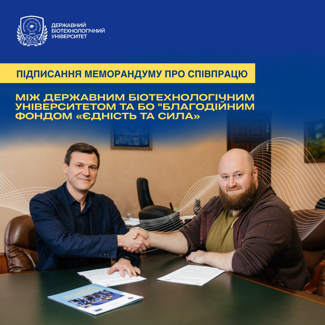 Державний біотехнологічний університет уклав Меморандум про співпрацю з БО «Благодійний фондом «Єдність та сила», що започатковує новий етап партнерської взаємодії у сфері освіти, науки та гуманітарних ініціатив.