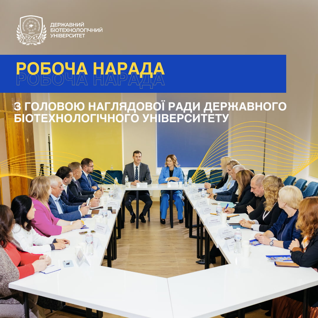У Державному біотехнологічному університеті відбулася змістовна робоча нарада за участю голови Наглядової ради ДБТУ, народної депутатки України, членкині Комітету Верховної Ради України з питань освіти, науки та інновацій, Голови підкомітету з питань вищої освіти, Юлії Миколаївни Гришиної.