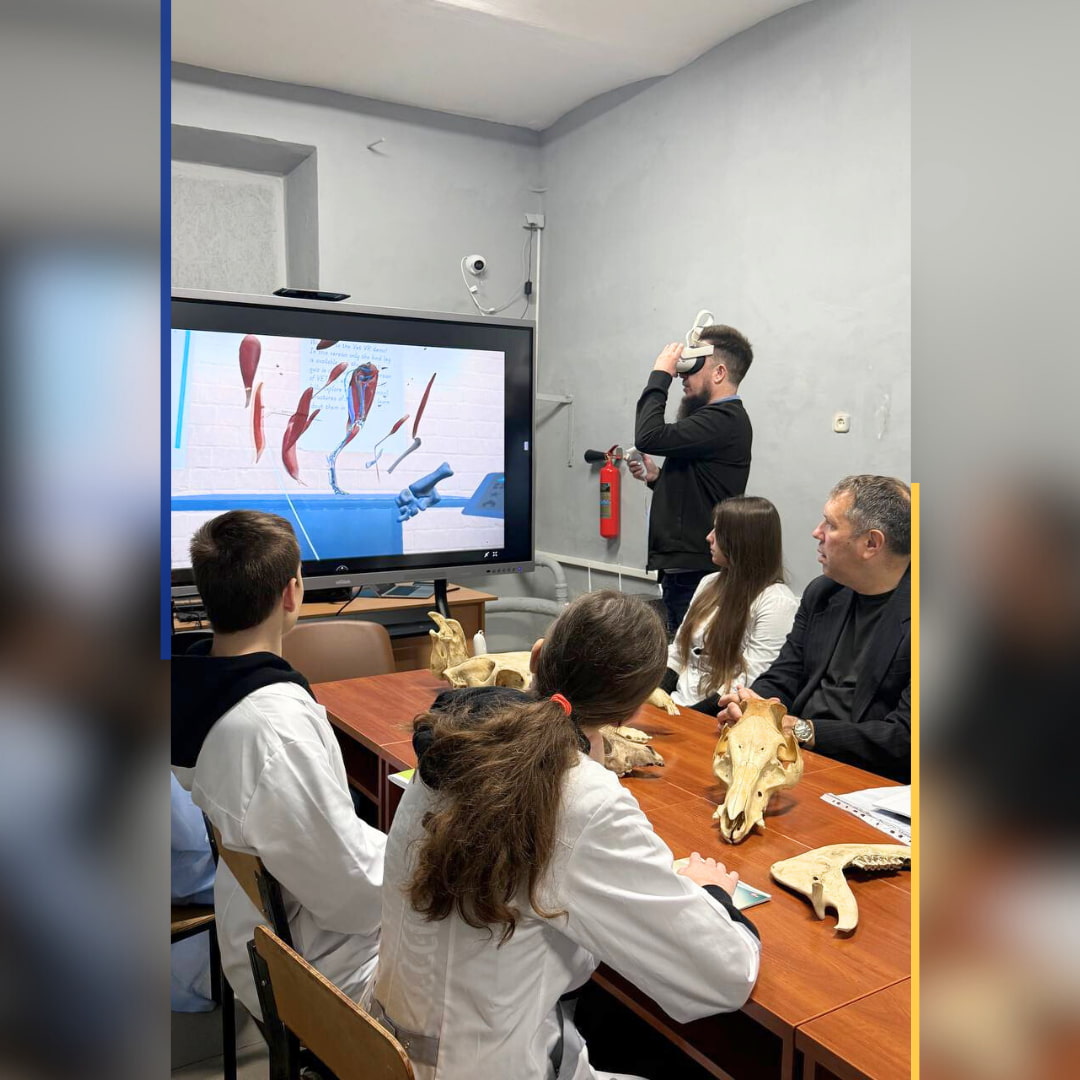 Особливою подією в межах зустрічі стала демонстрація застосування VR та AR технологій в освітньому процесі під час проведення виїзного практичного заняття з дисципліни «Анатомія свійських тварин» для здобувачів факультету ветеринарної медицини. Ця інноваційна ініціатива ДБТУ засвідчила високий рівень цифровізації навчання та прагнення університету до впровадження сучасних технологій у підготовку майбутніх фахівців.