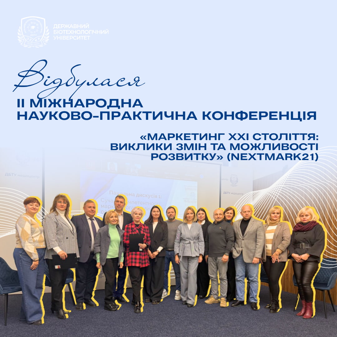 23 жовтня 2025 року в Державному біотехнологічному університеті відбулася ІІ Міжнародна науково-практична конференція «Маркетинг XXI століття: виклики змін та можливості розвитку» (NEXTMARK21), присвячена 30-річчю кафедри маркетингу, управління репутацією та клієнтським досвідом.