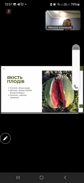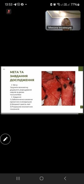 Микола Іноземцев, студент факультету агрономії та захисту рослин Державного біотехнологічного університету, представив результати власних досліджень із вирощування кавунів за традиційною та органічною системою в умовах прифронтової Донеччини – доказ того, що навіть у складних (в усіх сенсах) регіонах органічні підходи можуть бути успішними!