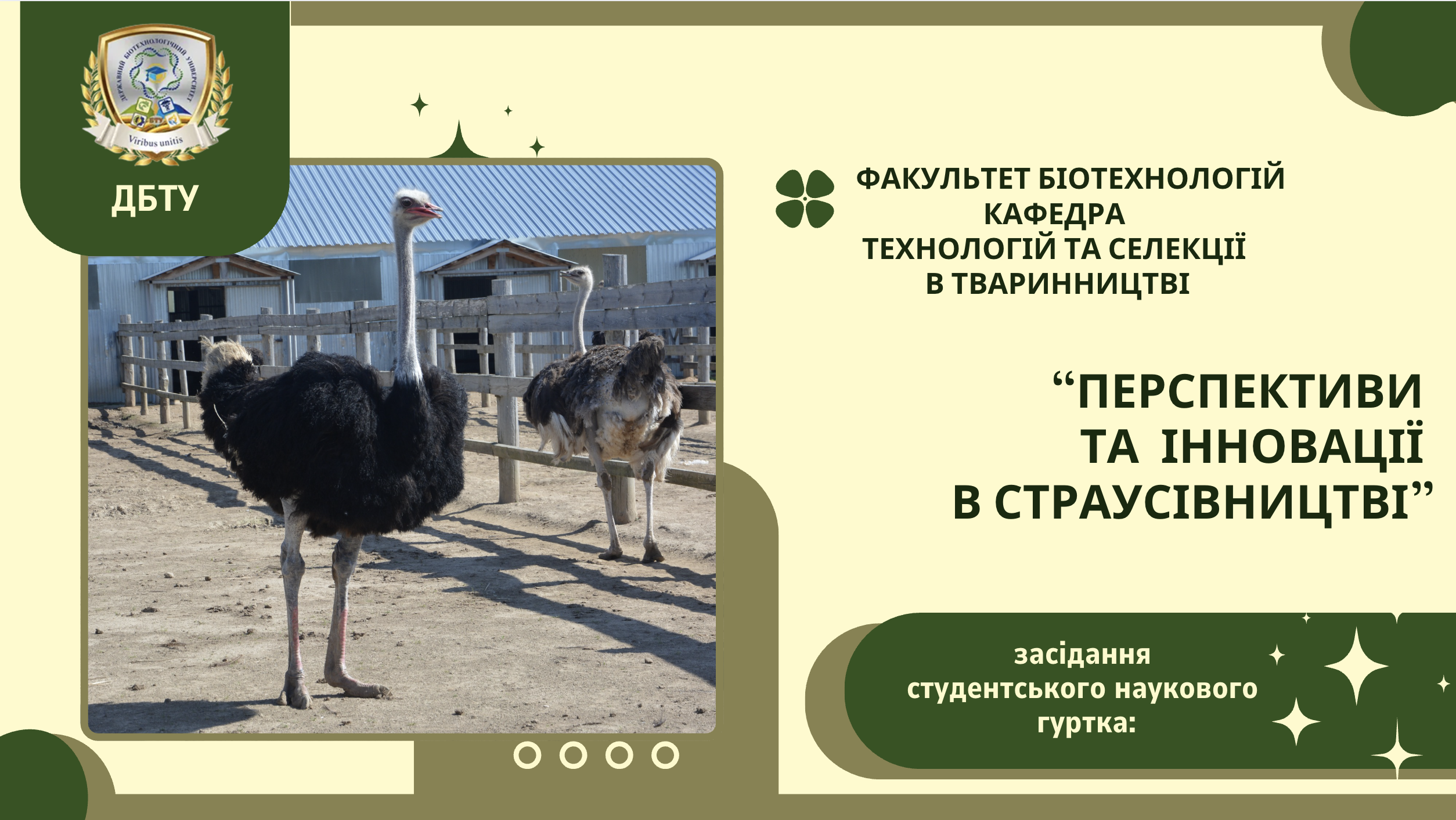 29.10.2025 року в он –лайн режимі на кафедрі «Технологій та селекції в тваринництві» під керівництвом доцента кафедри Гончарової Ірини Іванівни було проведено засідання студентського наукового гуртка на тему «Перспективи та інновації в страусівництві». Під час заходу було обговорено економічні аспекти вирощування страусів, продуктивність та використання страусів, перспективи та інновації в страусівництві, маркетинг та продаж продукції з страусів.