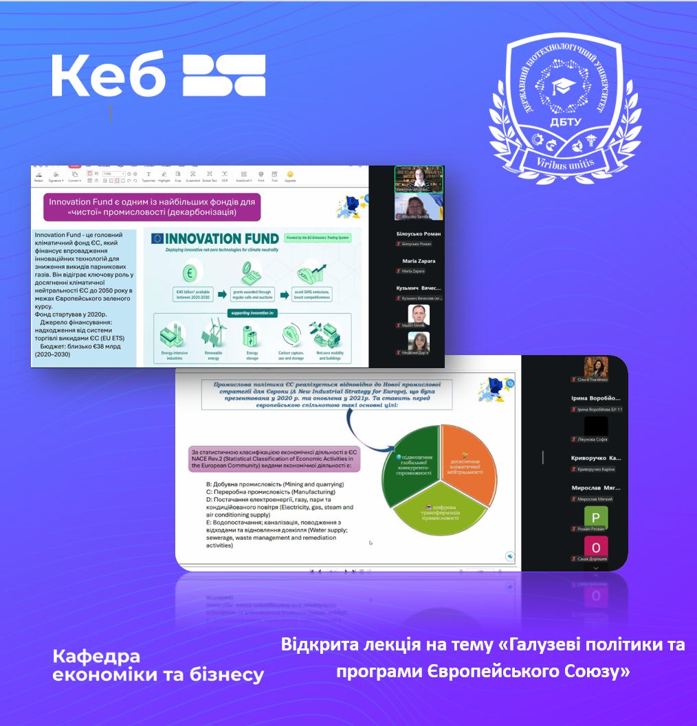 Під час лекції було розглянуто питання розвитку галузевої політики в контексті стратегічного розвитку Європейського Союзу, а також особливості формування та реалізації програм підтримки галузей економіки. Окрему увагу приділено впливу Європейського зеленого курсу на сучасну галузеву політику ЄС. Також було висвітлено можливості участі національних підприємств і територіальних громад у відповідних європейських програмах.