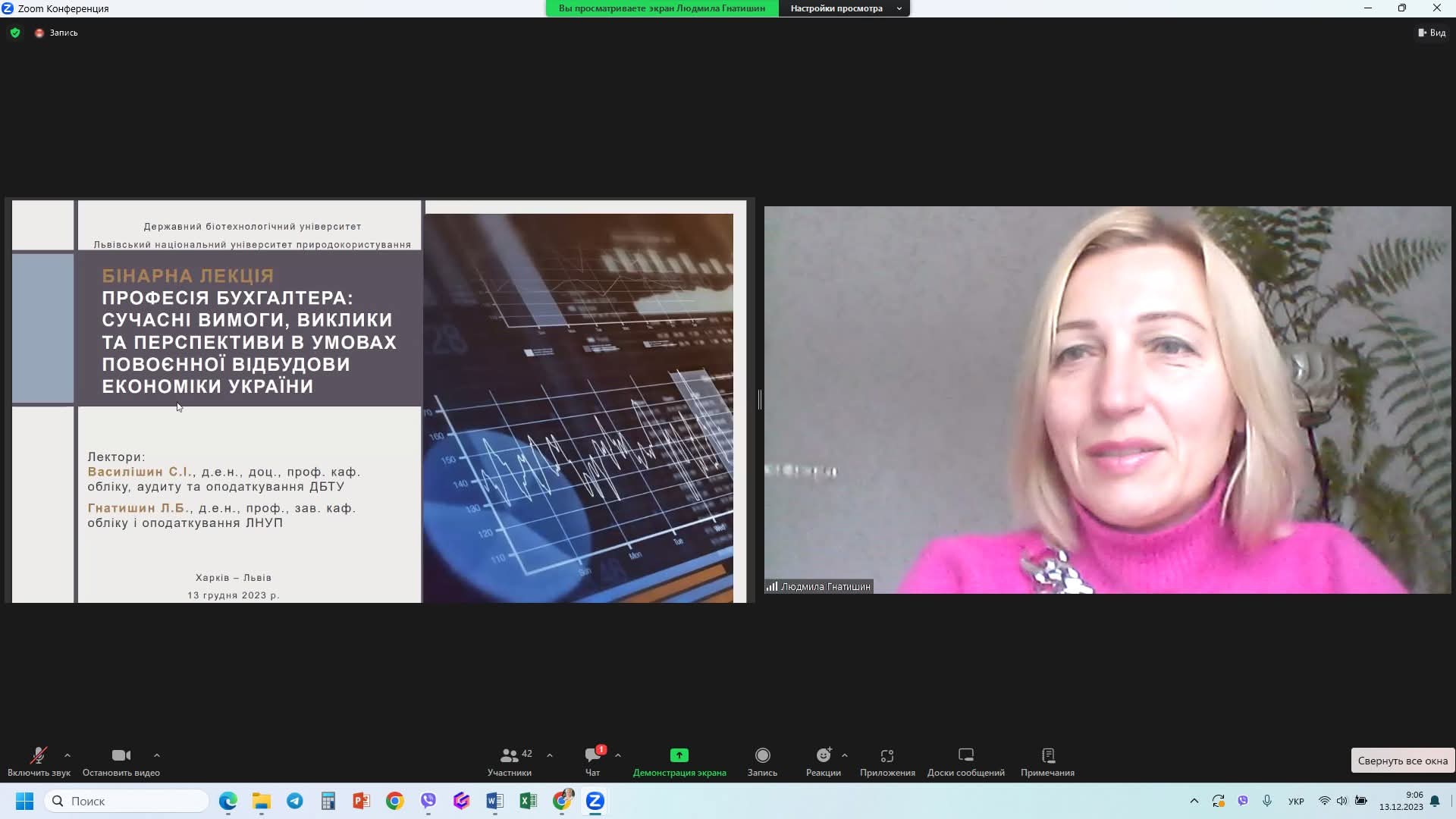 13 грудня 2023 року відбулася бінарна лекція для здобувачів спеціальності 071 «Облік і оподаткування» Державного біотехнологічного університету та Львівського національного університету природокористування на тему: «Професія бухгалтера: сучасні вимоги, виклики та перспективи в умовах повоєнної відбудови економіки України».