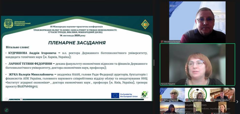 14 листопада 2025 року на базі Державного біотехнологічного університету відбулася ІІІ Міжнародна науково-практична конференція «Трансформація обліку та бізнес-консалтингу в умовах невизначеності: сучасні тренди, виклики, міжнародний досвід». Захід проходив в межах реалізації грантового проєкту «Біокластери ЄС: досвід формування та управління для забезпечення сталості українських агроекосистем» (BioЕFM4Agro) (№101176911) напряму Жан Моне програми Еразмус+.