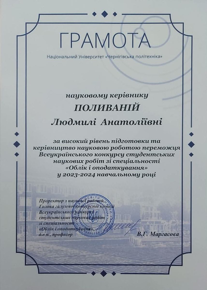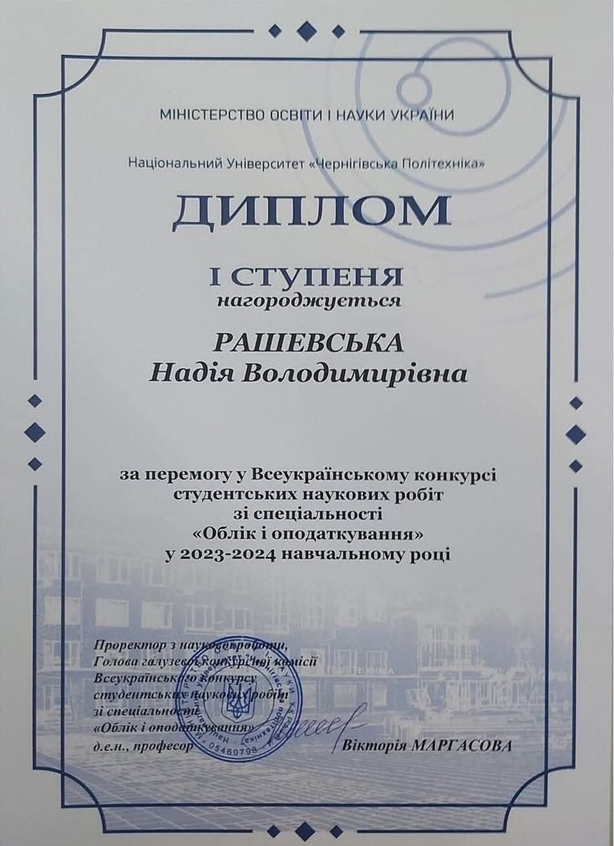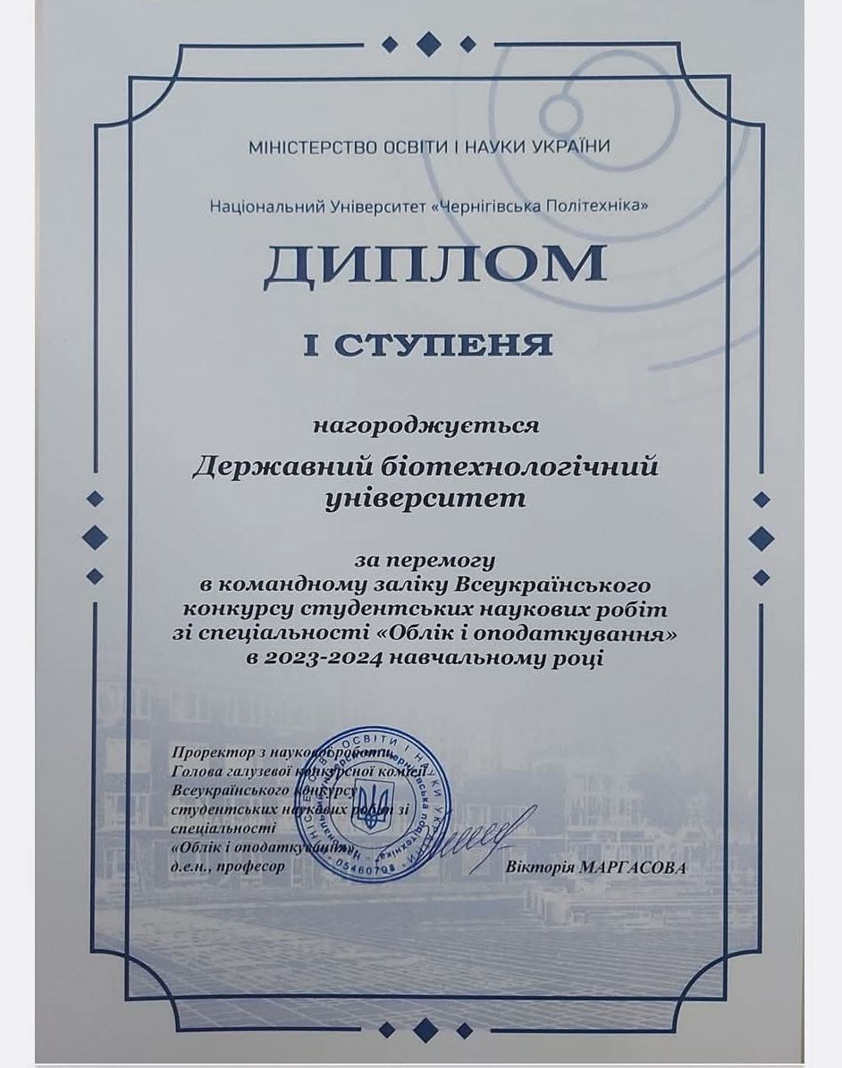 У квітні 2024 року здобувачі вищої освіти спеціальності 071 «Облік і оподаткування» кафедри обліку, аудиту та оподаткування Державного біотехнологічного університету взяли участь у Всеукраїнському конкурсі студентських наукових робіт. Організатором заходу виступила кафедра економіки, обліку і оподаткування Чернігівської політехніки.
