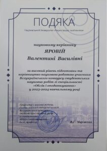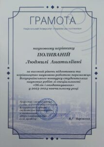 - Надія Рашевська, студентка 4 курсу, здобула перемогу та отримала Диплом І ступеня. Науковий керівник – доцент Поливана Людмила Анатоліївна.