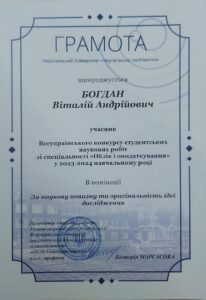 - Віталій Богдан, студент 3 курсу, був відзначений Грамотою за наукову новизну. Науковий керівник — доцент Ярова Валентина Василівна.