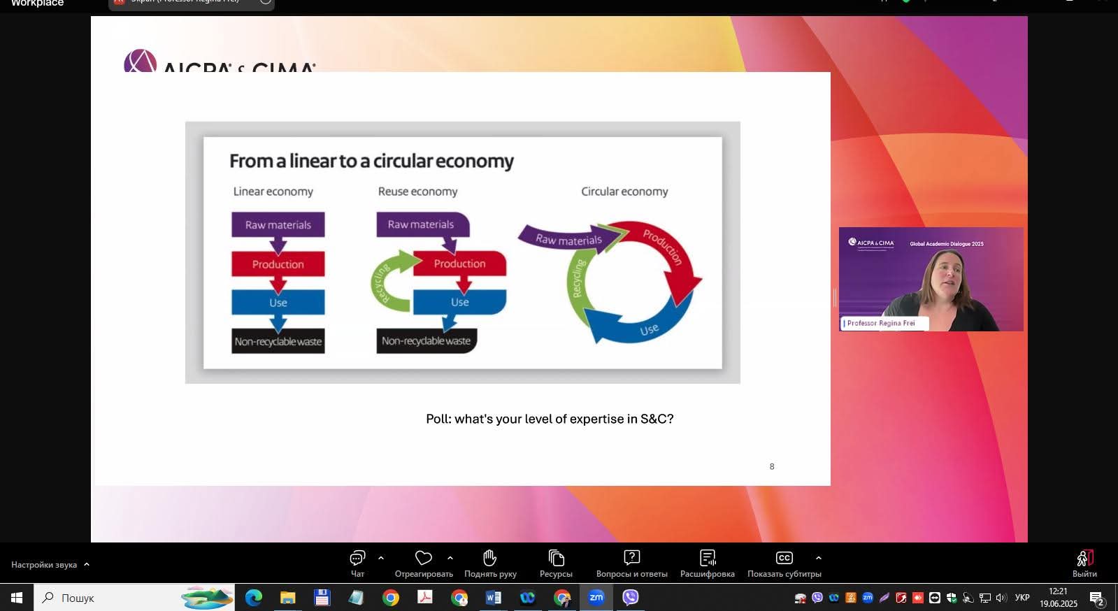 19 червня 2025 року відбувся міжнародний науково-освітній захід AICPA & CIMA Global Academic Dialogue на тему «The Circularity Radar: sustainability and circularity». Під час події професорка Лондонського університету мистецтв Регіна Фрей представила концепцію Circularity Radar – інструменту, що дозволяє підприємствам оцінювати рівень сталості та циклічності їхніх операцій, а також визначати шляхи подальшого розвитку.