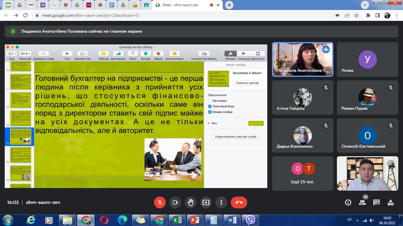 Модератором семінару виступила к.е.н., доцент кафедри обліку, аудиту та оподаткування Людмила Поливана, яка у своїй доповіді акцентувала увагу на ключових перевагах та перспективах професії бухгалтера, підкресливши її стратегічне значення у забезпеченні ефективності бізнес‑процесів та фінансового управління. Під час семінару було гармонійно поєднано інформативну лекційну складову з інтерактивними елементами, що сприяло активізації пізнавальної діяльності учнів та формуванню атмосфери конструктивної взаємодії між викладачами, школярами та їхніми батьками.
