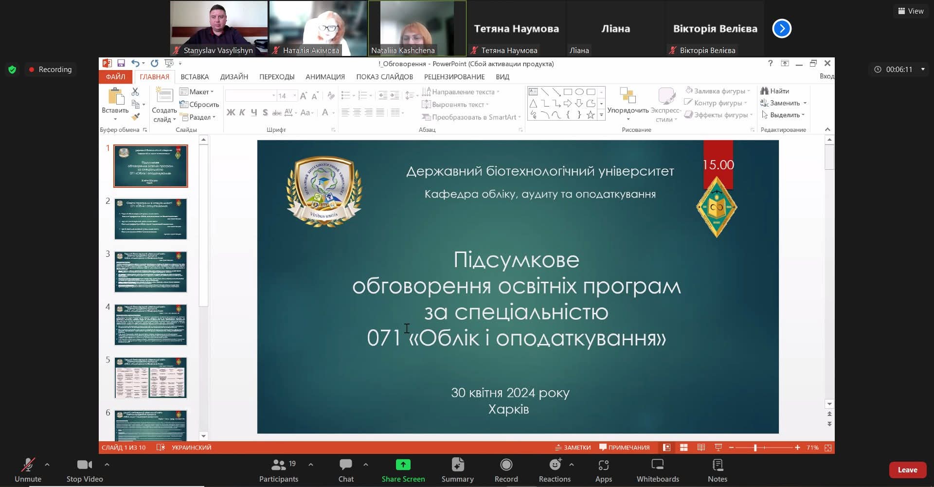 30 квітня 2024 року на кафедрі обліку, аудиту та оподаткування Державного біотехнологічного університету відбулося підсумкове обговорення проектів освітніх програм зі спеціальності 071 «Облік і оподаткування» галузі знань «Управління та адміністрування».