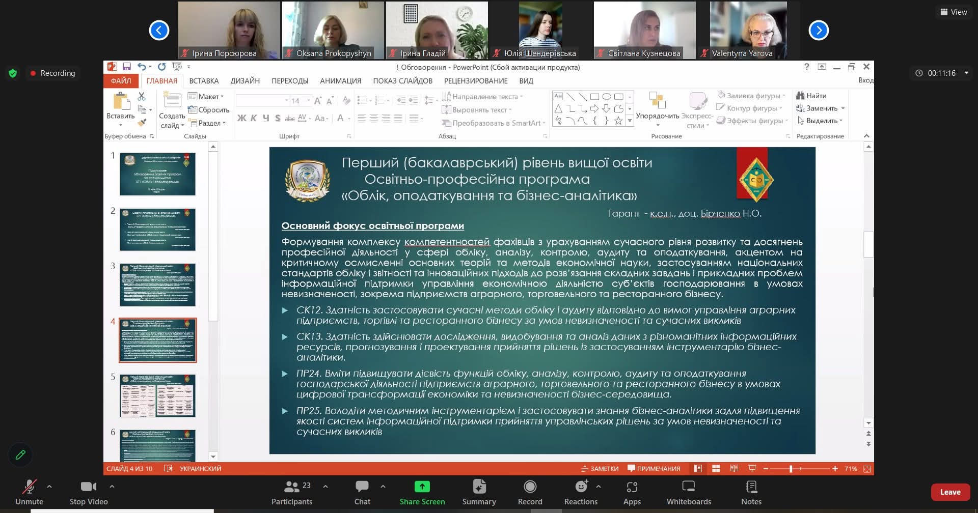Завідувач кафедри, доктор економічних наук, професор Наталія Борисівна Кащена презентувала освітні програми з позиції їх цільової спрямованості, фокусу, змістовного наповнення та логічної послідовності формування освітніх результатів і набуття освітніх ступенів у сфері обліку й оподаткування. Гаранти освітніх програм акцентували увагу на їх актуальності, унікальності та комплексному характері, а також відповідності сучасним і перспективним потребам ринку праці.