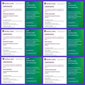 Щиро дякуємо директору академічних ініціатив CGMA Karen Phang та команді CIMA Україна (Natalie Vovchuk, Marina Zayceva) за запрошення до гри та співпрацю! Участь у грі надихає нас і надалі інтегрувати ESG-підходи в освітні програми та формувати нове покоління бухгалтерів-лідерів майбутнього.