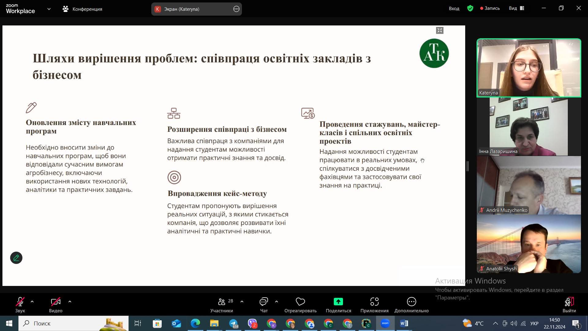 Учасники круглого столу обговорили виклики сучасного бізнес-середовища та практичну складову освітніх програм. Концептуально важливими були виступи провідних науковців — Наталії Лоханової, Наталії Кащеній, Ольги Павелко та Володимира Осмятченка. Під час дискусії учасники ділилися досвідом, аналізували актуальні проблеми підготовки фахівців для аграрного сектору та шляхи посилення співпраці між освітою і бізнесом. Подібні ініціативи сприяють орієнтації навчальних програм на потреби роботодавців, формуванню у студентів необхідних професійних навичок та підвищенню їх конкурентоспроможності на ринку праці. Бачення бізнесу щодо необхідних навичок майбутніх фахівців представили також Олександр Кедес (ТОВ «Грозбер Україна»), Роман Сластьон (ICL Groving Solutions), Андрій Грабарєв (НБУ) та Катерина Сорокіна (ТОВ «А.Т.К»). Цікавим доповненням став виступ студентки Вікторії Штакал, яка поділилася власним баченням практичної підготовки та отримала підтримку колег.