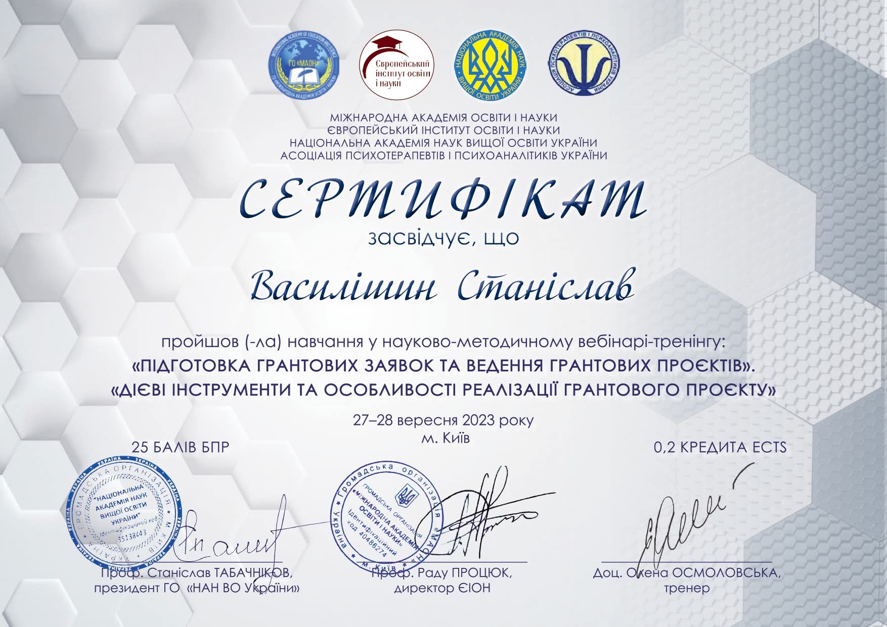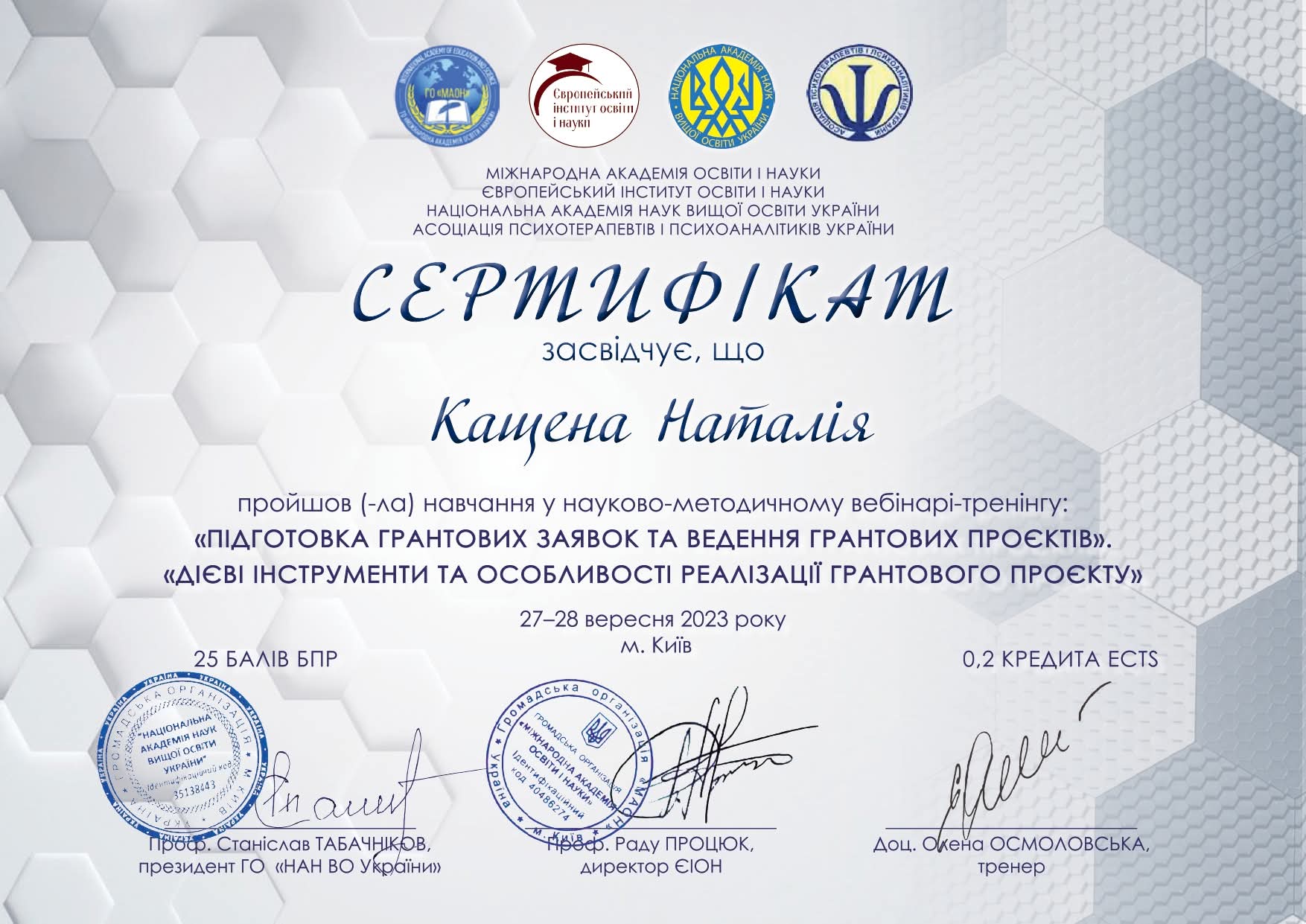 27–28 вересня 2023 року викладачі кафедри обліку, аудиту та оподаткування ДБТУ – завідувачка кафедри Наталія Кащена, професор Станіслав Василішин та доцент Ірина Нестеренко – взяли участь у дводенному тренінгу «Підготовка грантових заявок та ведення грантових проєктів». Захід було організовано ГО «Міжнародна академія освіти і науки», «Національна академія наук вищої освіти України» та «Асоціація психотерапевтів і психоаналітиків України».