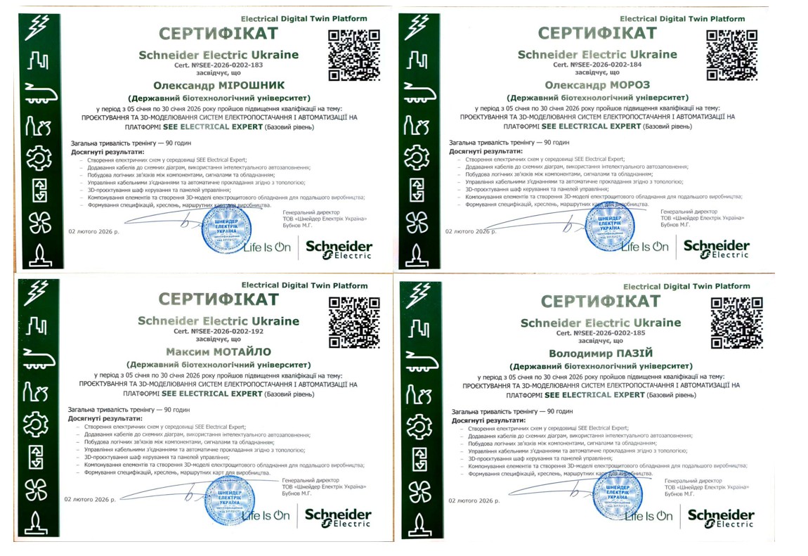 З 5 по 30 січня 2026 року НПП кафедри електропостачання та енергетичного менеджменту пройшли курси підвищенні кваліфікації компанії Schneider Electric на тему проектування та 3D-моделювання електротехнічних систем електропостачання і автоматизації на платформі SEE ELECTRICAL EXPERT.