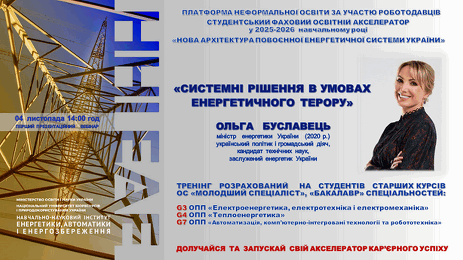 4 листопада 2025 року науково-педагогічні працівники кафедри електропостачання та енергетичного менеджменту разом із здобувачами освітньої програми 141 «Електроенергетика, електротехніка та електромеханіка» взяли участь у черговому фаховому студентському акселераторі «Системні рішення в умовах енергетичного терору».