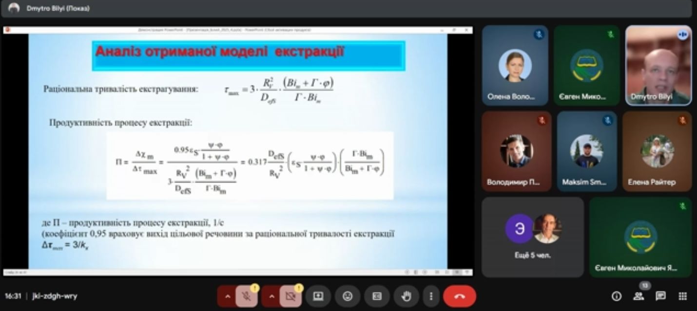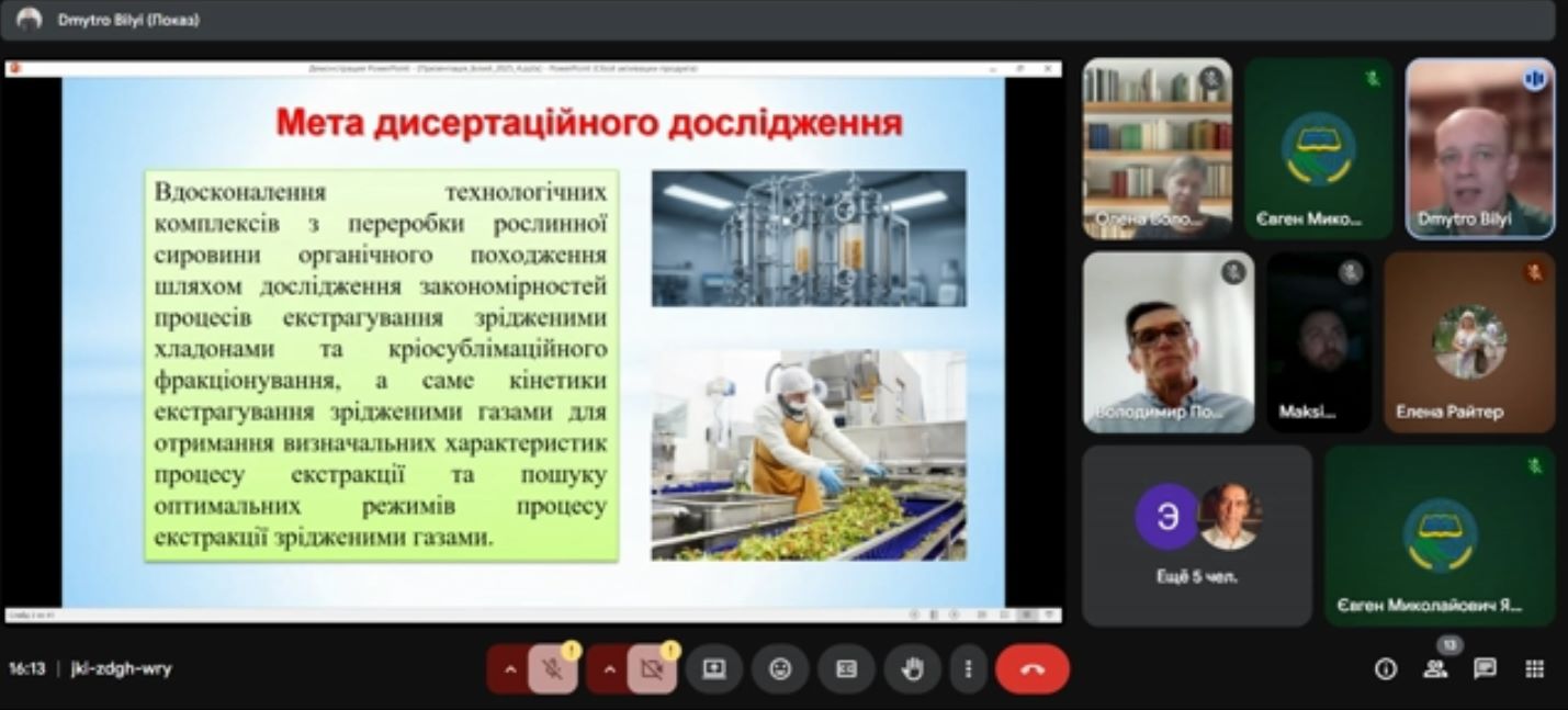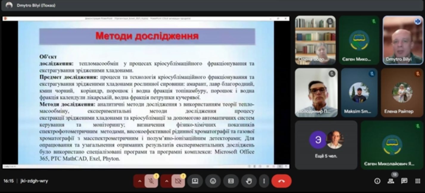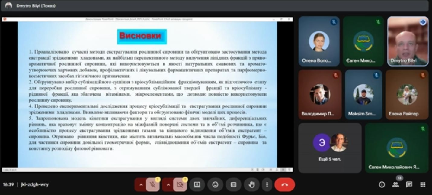 Під час семінару Дмитро Володимирович детально представив ключові теоретичні положення, методику та практичні результати свого дослідження, які мають значний потенціал для впровадження у харчовій промисловості. Особлива увага була приділена інноваційним підходам до використання зріджених газів, що дозволяє отримувати високоякісні екстракти та фракції з цінної рослинної сировини зі збереженням її корисних властивостей.