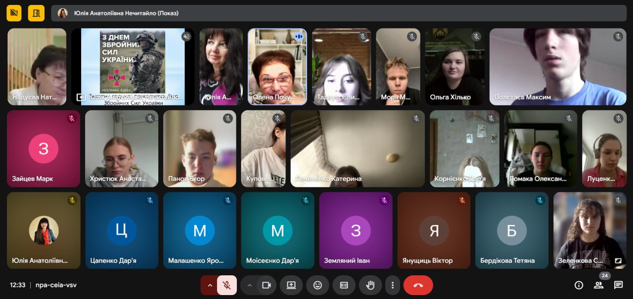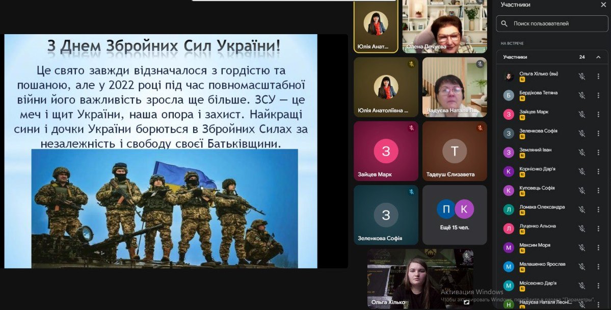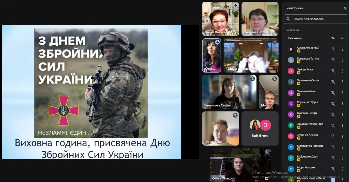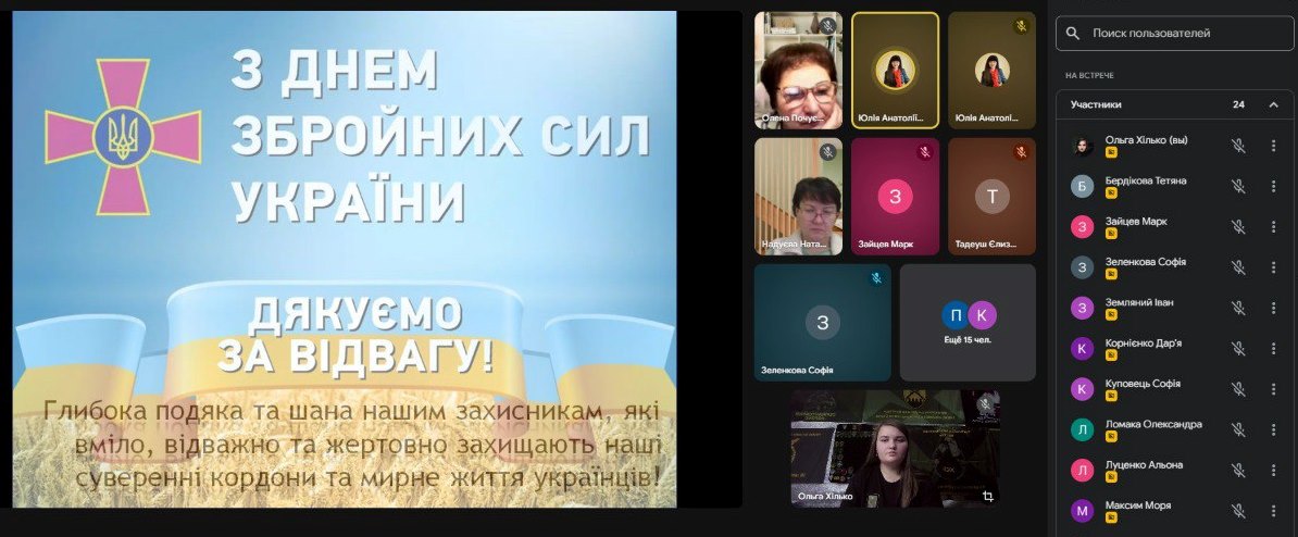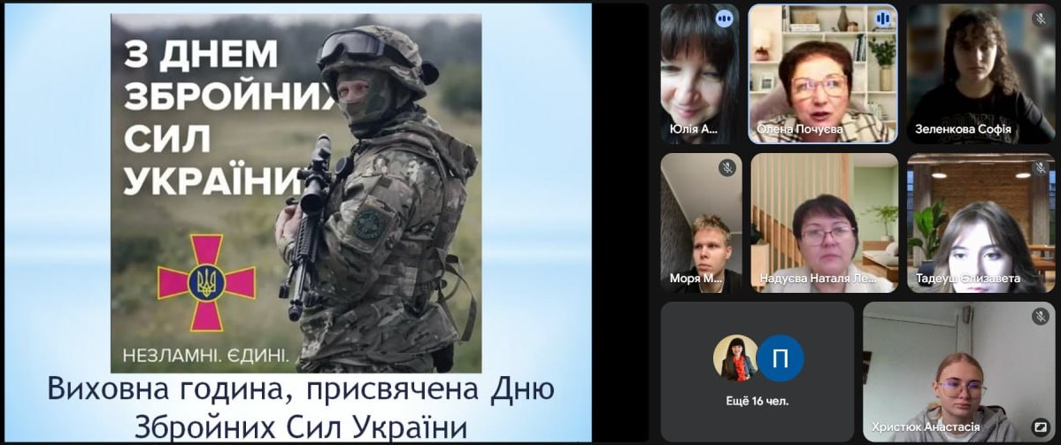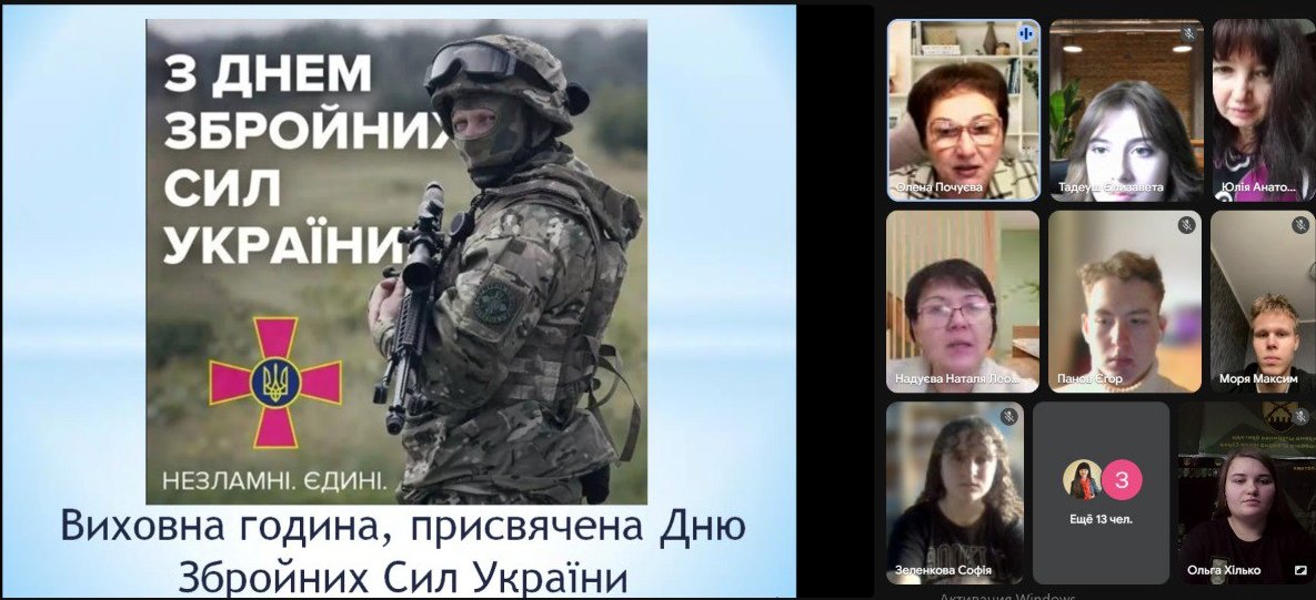 Нечитайло Ю.А. відкрила захід, нагадавши учням, що 6 грудня в Україні щороку відзначається День Збройних Сил України — державне свято, встановлене на честь ухвалення у 1991 році Закону України «Про Збройні Сили України». Здобувачі ознайомилися з історичними передумовами створення української армії, її значенням у період становлення незалежної держави та визначальною роллю у збереженні суверенітету України сьогодні. Наголошувалося, що у 2022–2024 роках, у період активних бойових дій проти російської агресії, це свято набуло особливої символічної сили, адже саме українські військові щоденно забезпечують обороноздатність держави та наближають нашу спільну перемогу.