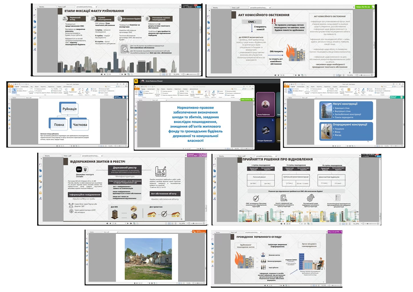 Розглянуті актуальні питання нормативно-правового забезпечення визначення шкоди та збитків, завданих внаслідок пошкодження, знищення об’єктів житлового фонду та громадських будівель державної і комунальної власності, зазначений порядок фіксації пошкоджень будівель і споруд, та особливості проведення комісійного та технічного обстеження. Надані поради щодо правильної фіксації та оформлення відповідних документів.