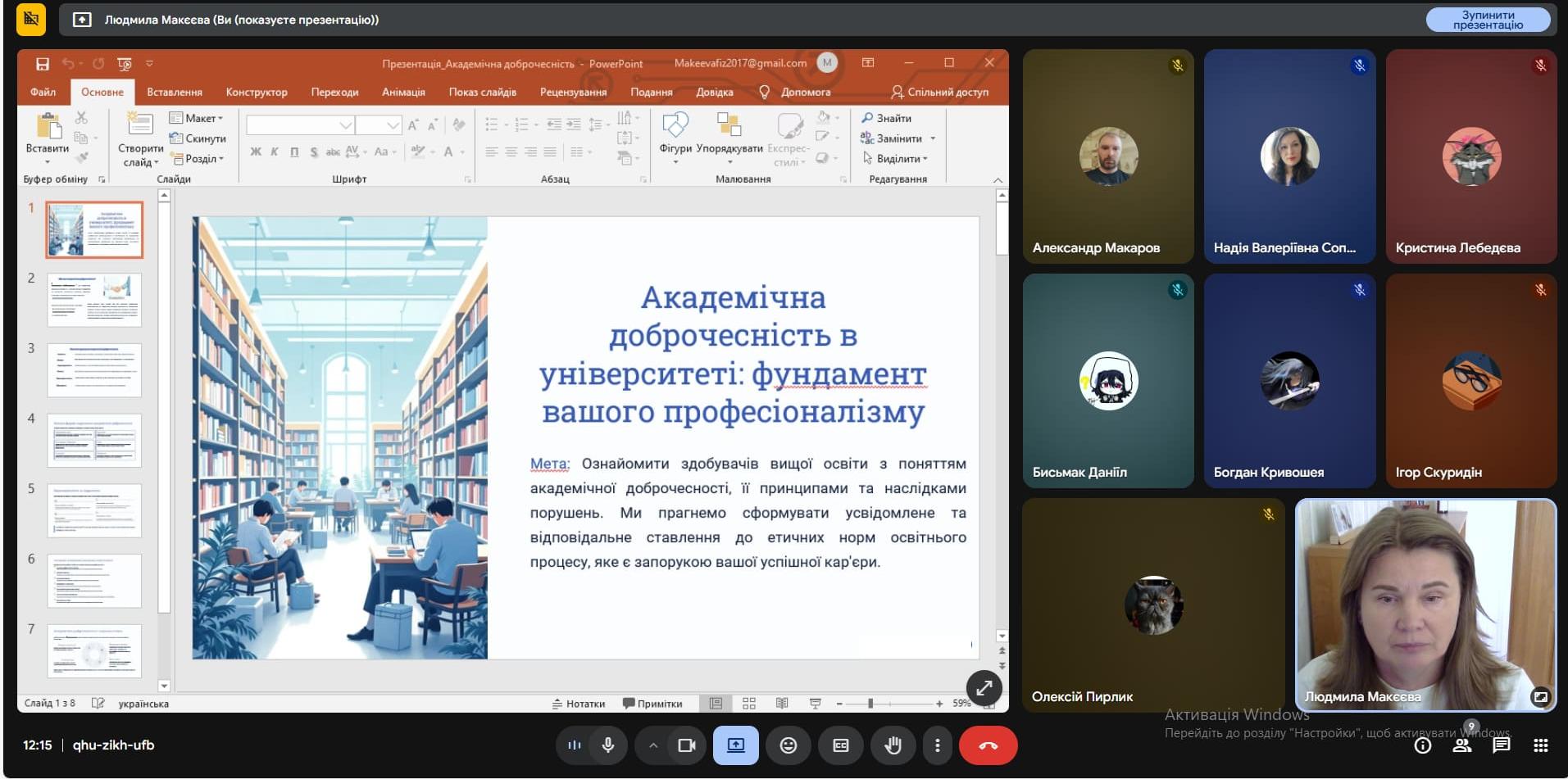 У ході обговорення було визначено основні принципи академічної доброчесності – чесність, самостійність, об’єктивність та відповідальність, які формують дослідницьку культуру та професійні якості майбутнього землевпорядника. Куратор також наголосила на неприпустимості порушень доброчесності – плагіату, списування, фабрикації чи фальсифікації результатів, – та акцентувала увагу на важливості правильного оформлення посилань, використання достовірних джерел і самостійного виконання навчальних завдань.