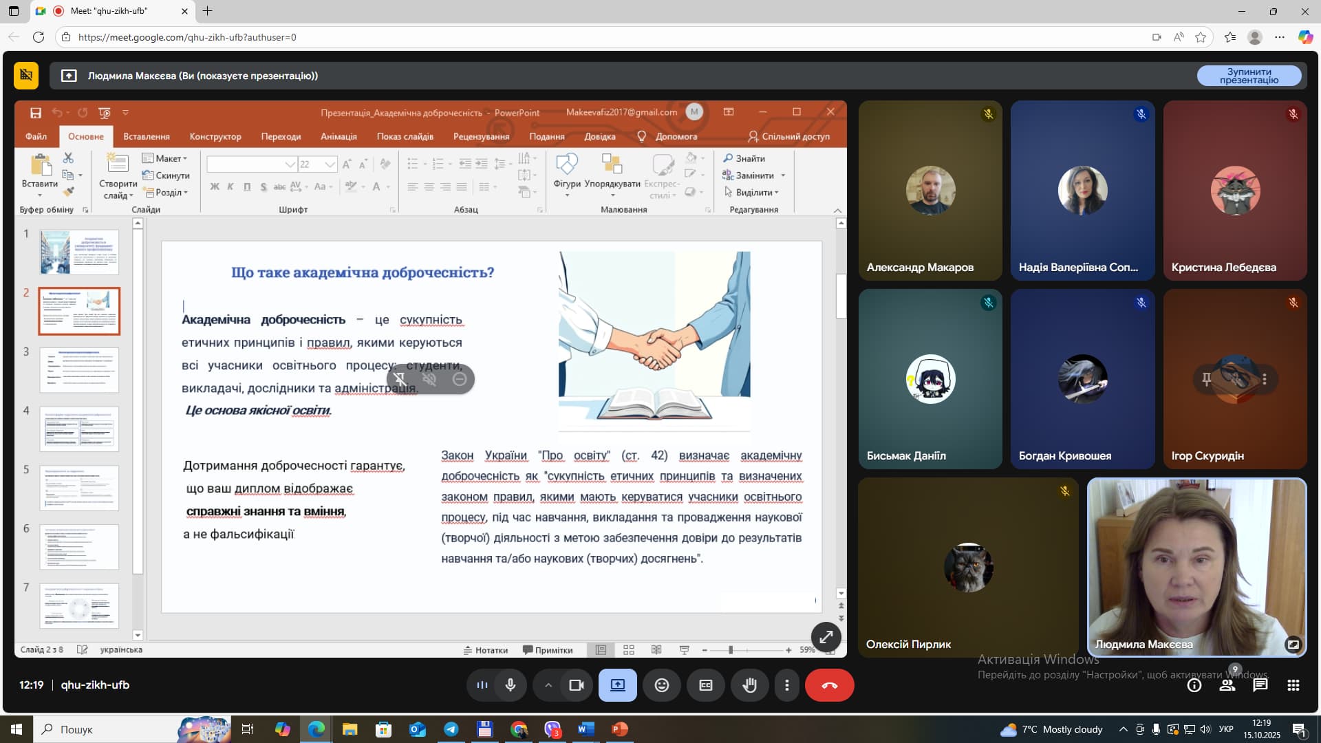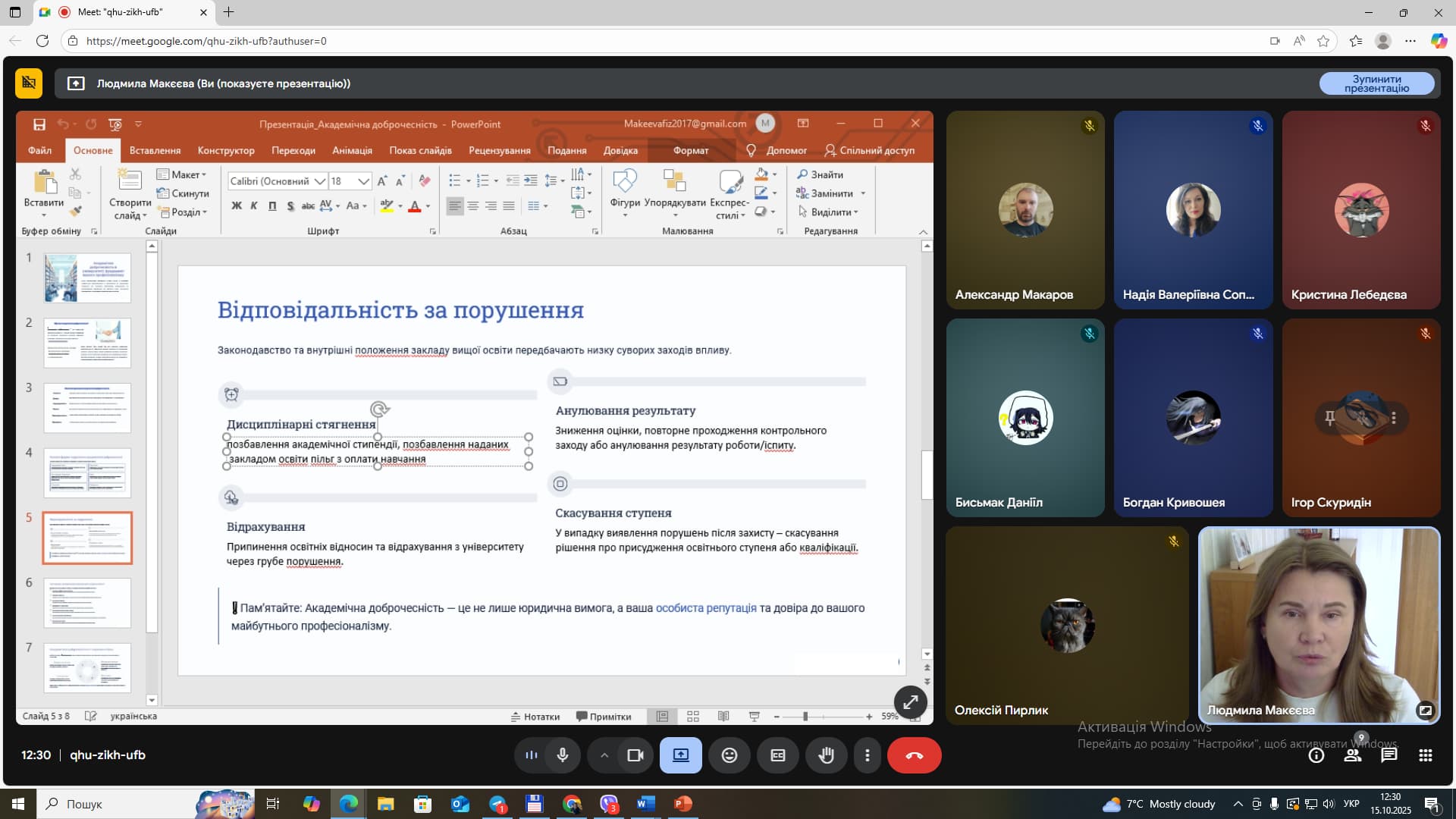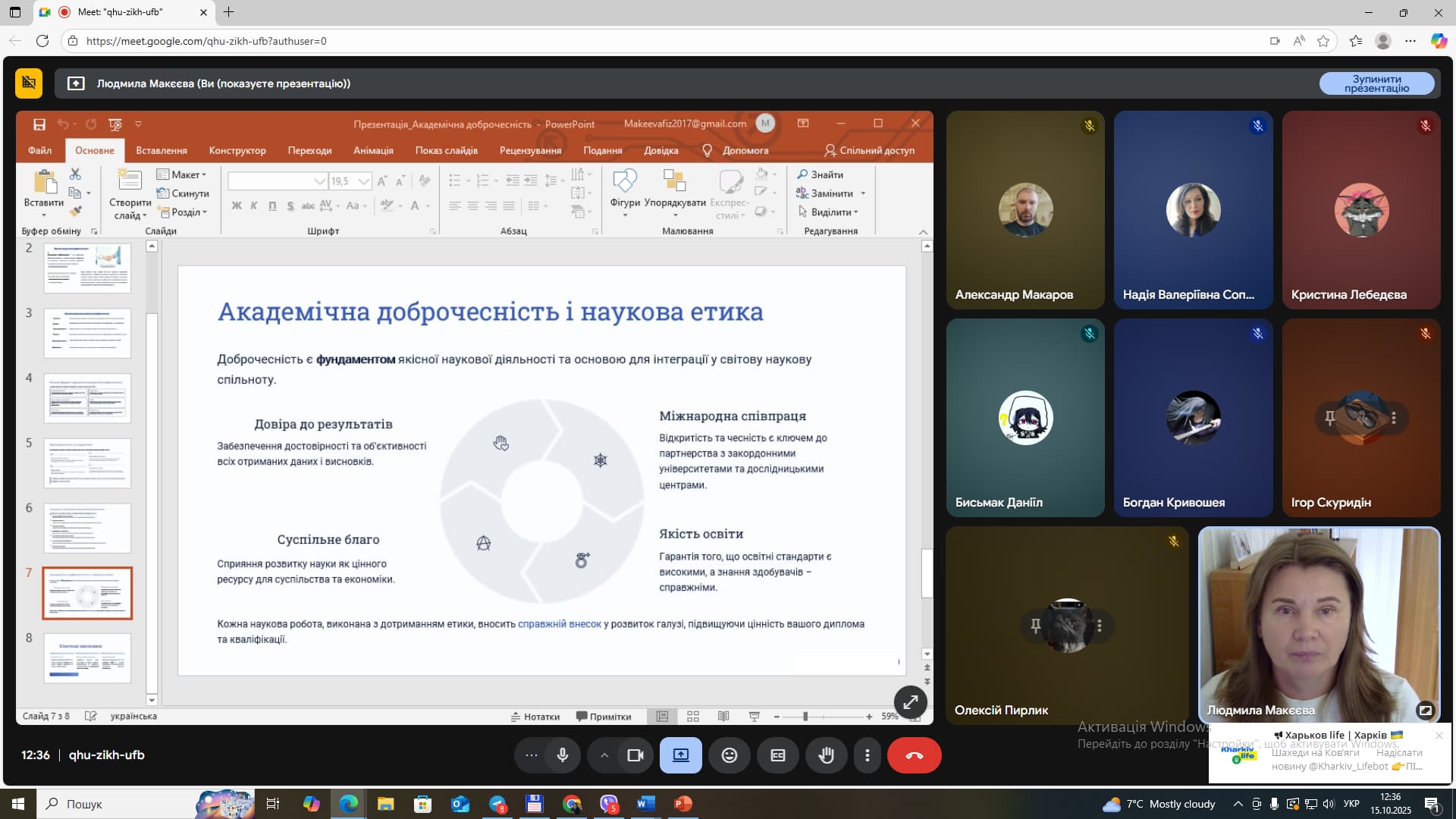 У ході обговорення було визначено основні принципи академічної доброчесності – чесність, самостійність, об’єктивність та відповідальність, які формують дослідницьку культуру та професійні якості майбутнього землевпорядника. Куратор також наголосила на неприпустимості порушень доброчесності – плагіату, списування, фабрикації чи фальсифікації результатів, – та акцентувала увагу на важливості правильного оформлення посилань, використання достовірних джерел і самостійного виконання навчальних завдань.