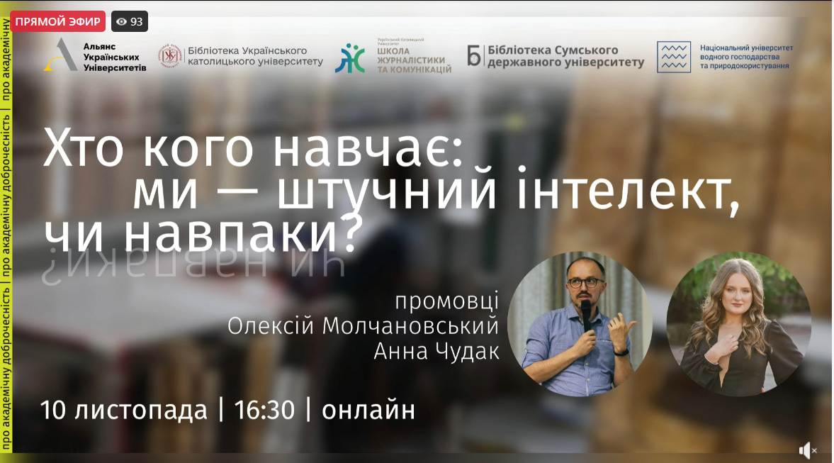 Наукова бібліотека УКУ організувала семінар-дискусію на тему «Хто кого навчає: ми – штучний інтелект, чи навпаки?», який об’єднав викладачів, студентів та працівників університету довкола обговорення ролі штучного інтелекту в освітньому процесі. Спікерами заходу виступили Олексій Молчановський, керівник Офісу з інновацій УКУ та Анна Чудак, менеджерка компанії Strike Plagiarism, модератор семінару Оксана Микитин, директорка бібліотеки УКУ.