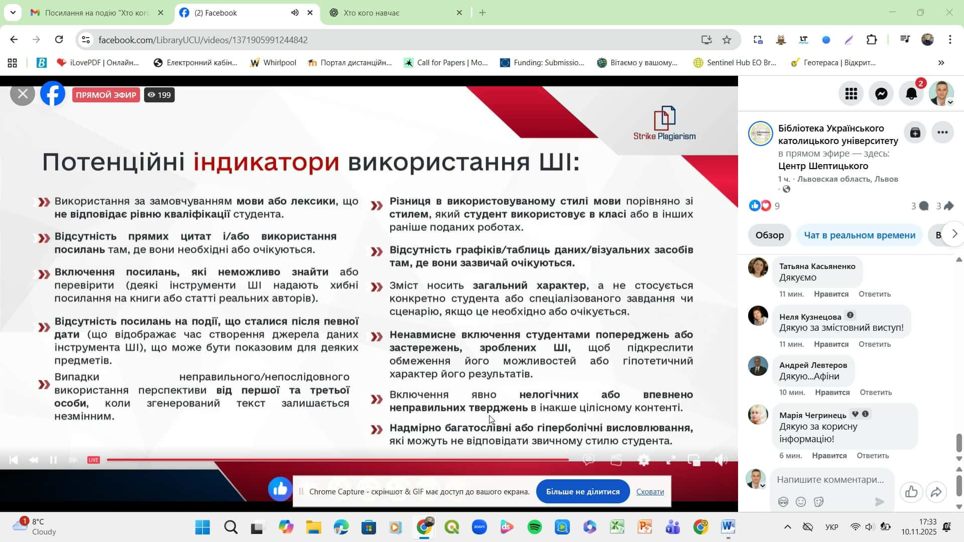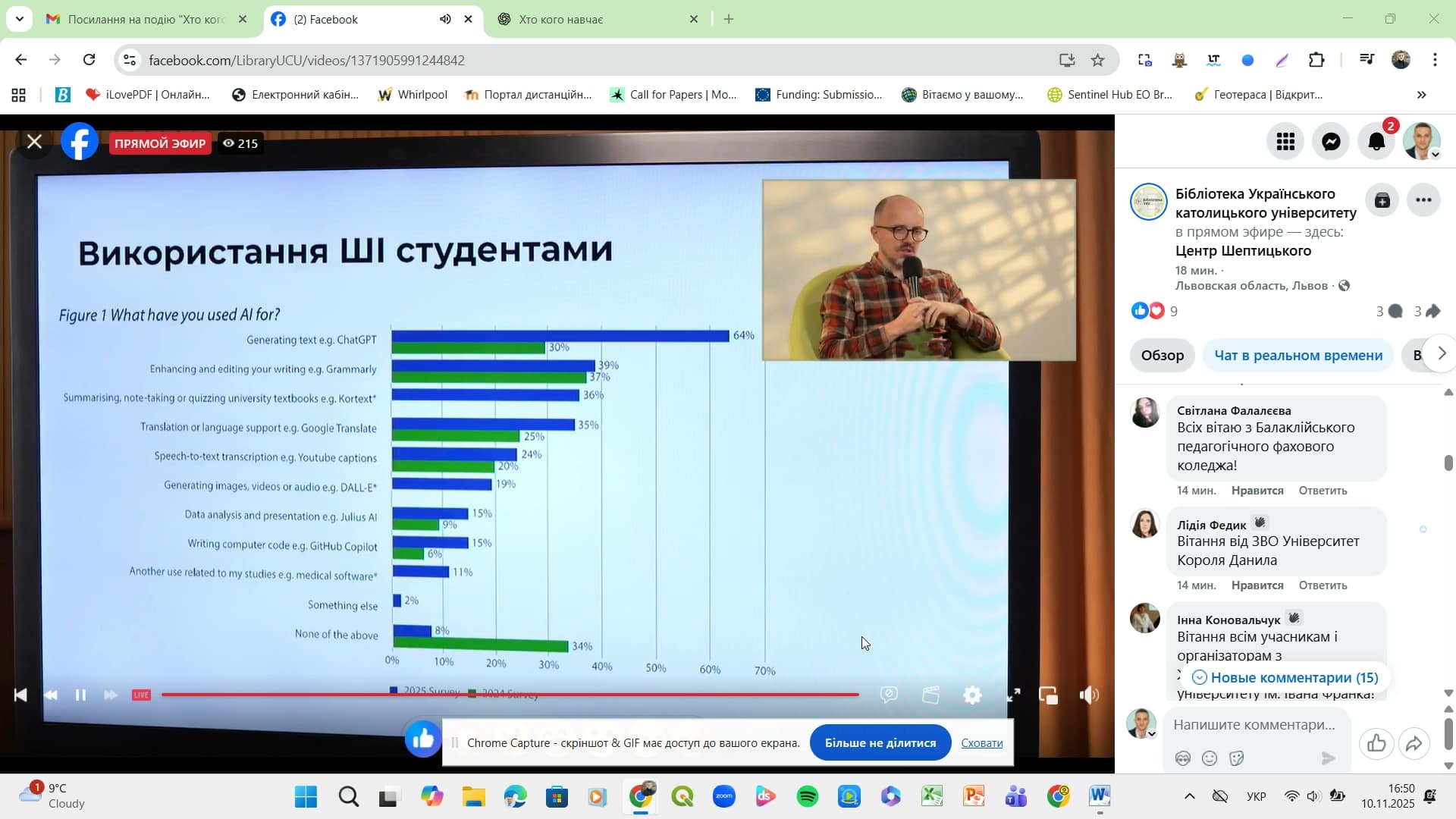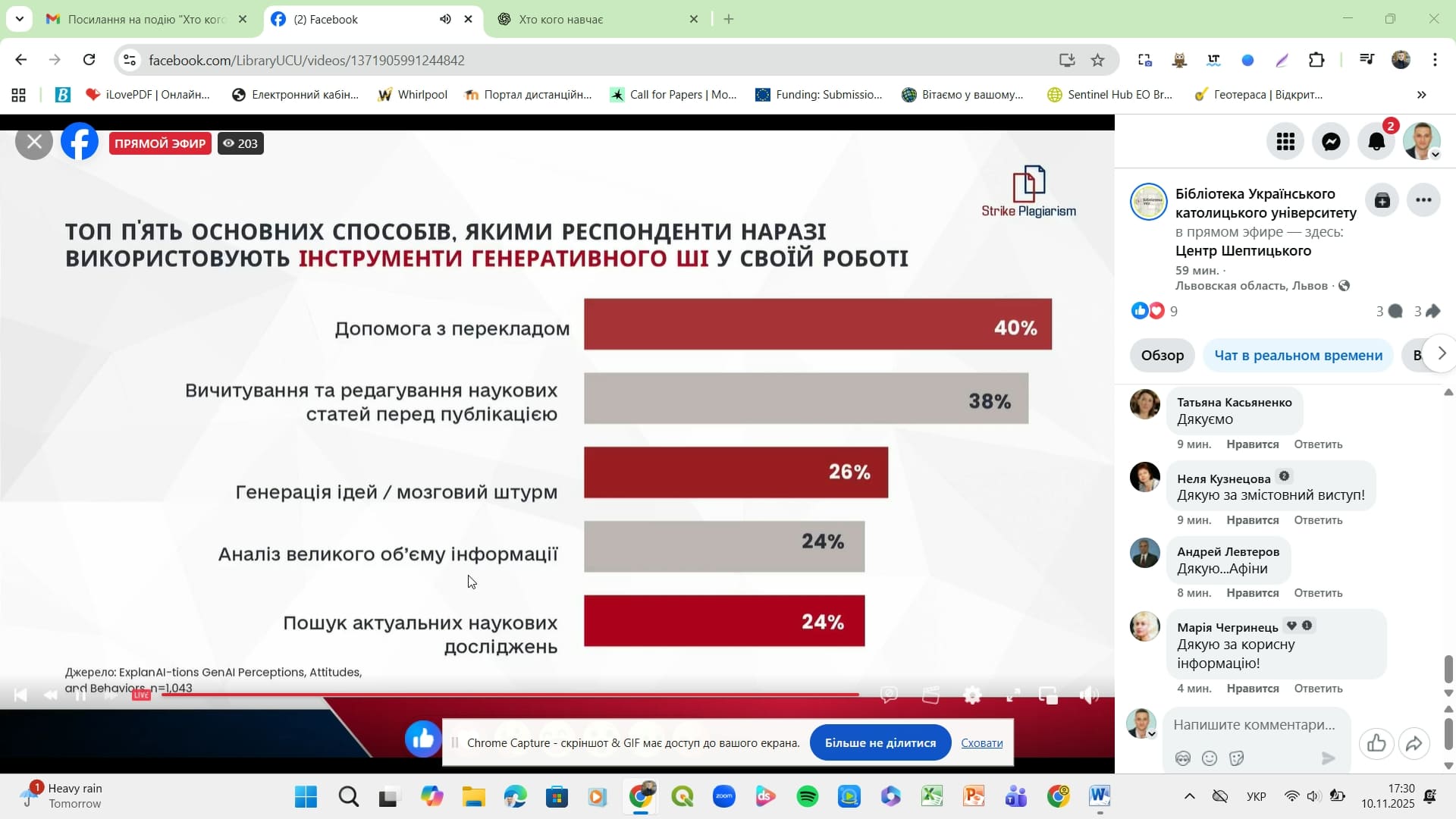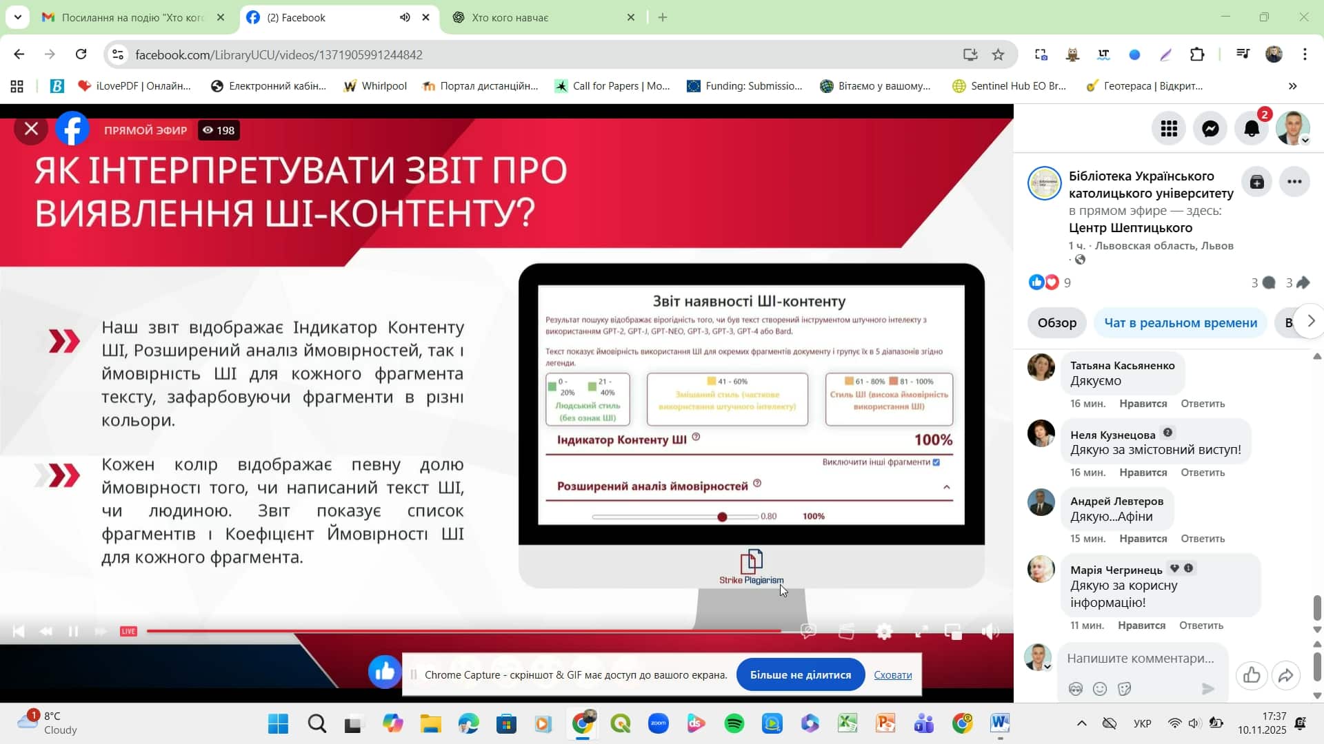Анна Чудак зосередила увагу на питаннях академічної доброчесності в умовах активного використання генеративних інструментів штучного інтелекту. Вона представила аналітику компанії Strike Plagiarism щодо тенденцій застосування ШI у написанні наукових і студентських робіт та розповіла про вдосконалення алгоритмів перевірки для виявлення текстів, створених із допомогою таких технологій.
