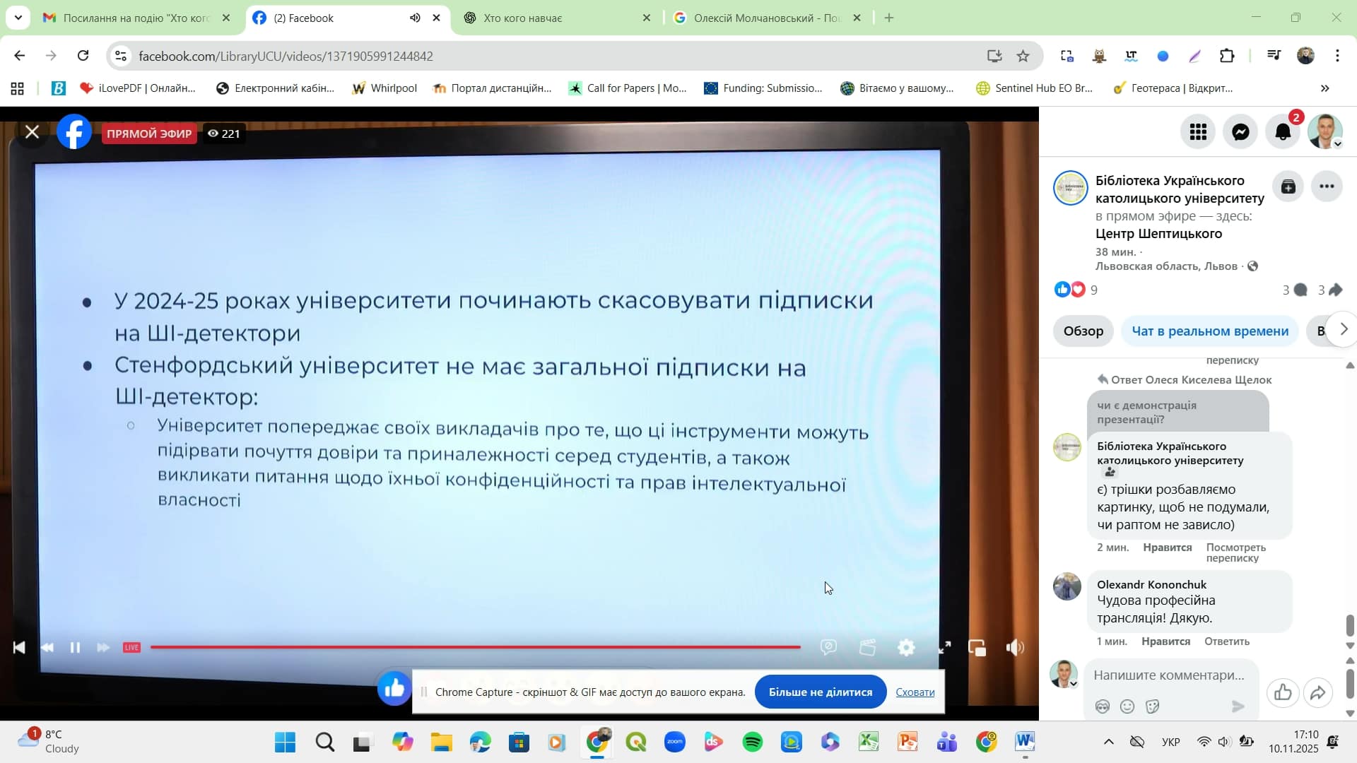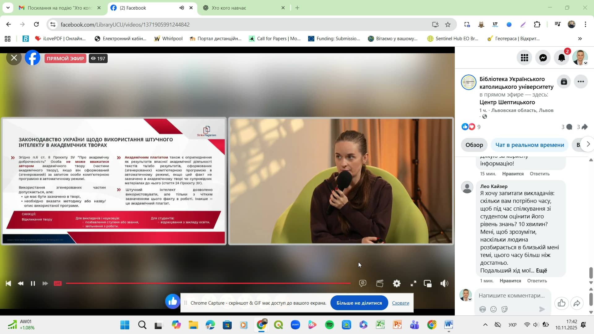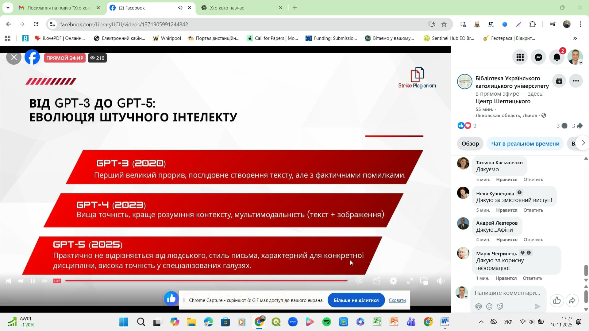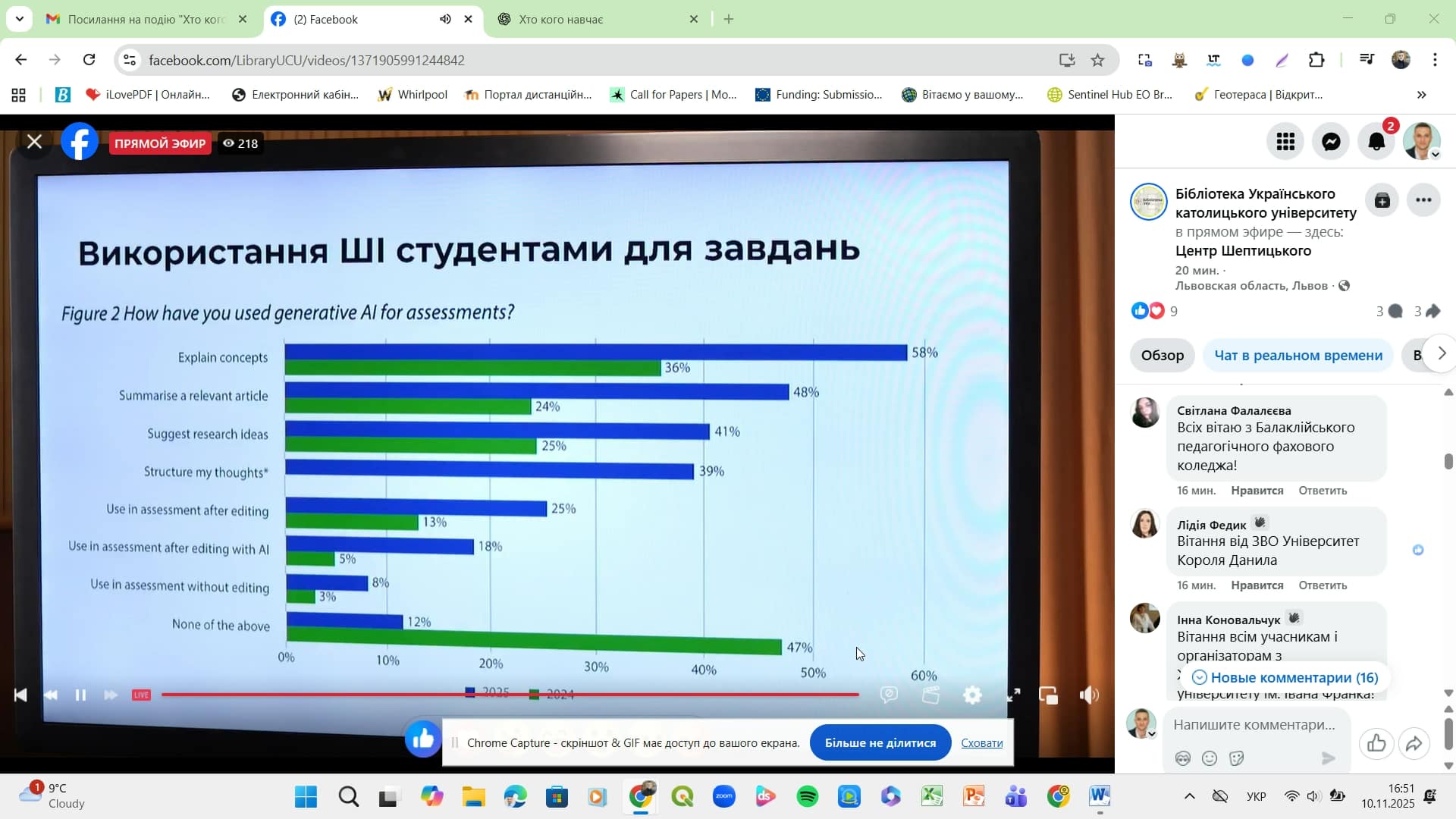 Анна Чудак зосередила увагу на питаннях академічної доброчесності в умовах активного використання генеративних інструментів штучного інтелекту. Вона представила аналітику компанії Strike Plagiarism щодо тенденцій застосування ШI у написанні наукових і студентських робіт та розповіла про вдосконалення алгоритмів перевірки для виявлення текстів, створених із допомогою таких технологій.