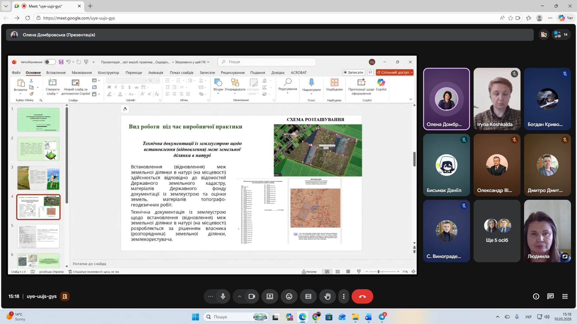 На кафедрі управління земельними ресурсами, геодезії та кадастру відбувся захист звітів з виробничої та переддипломної практик здобувачів першого (бакалаврського) рівня вищої освіти спеціальності 193 «Геодезія та землеустрій». Цей етап є важливою складовою освітнього процесу, адже дозволяє підсумувати результати практичної підготовки здобувачів та оцінити рівень сформованих компетентностей.