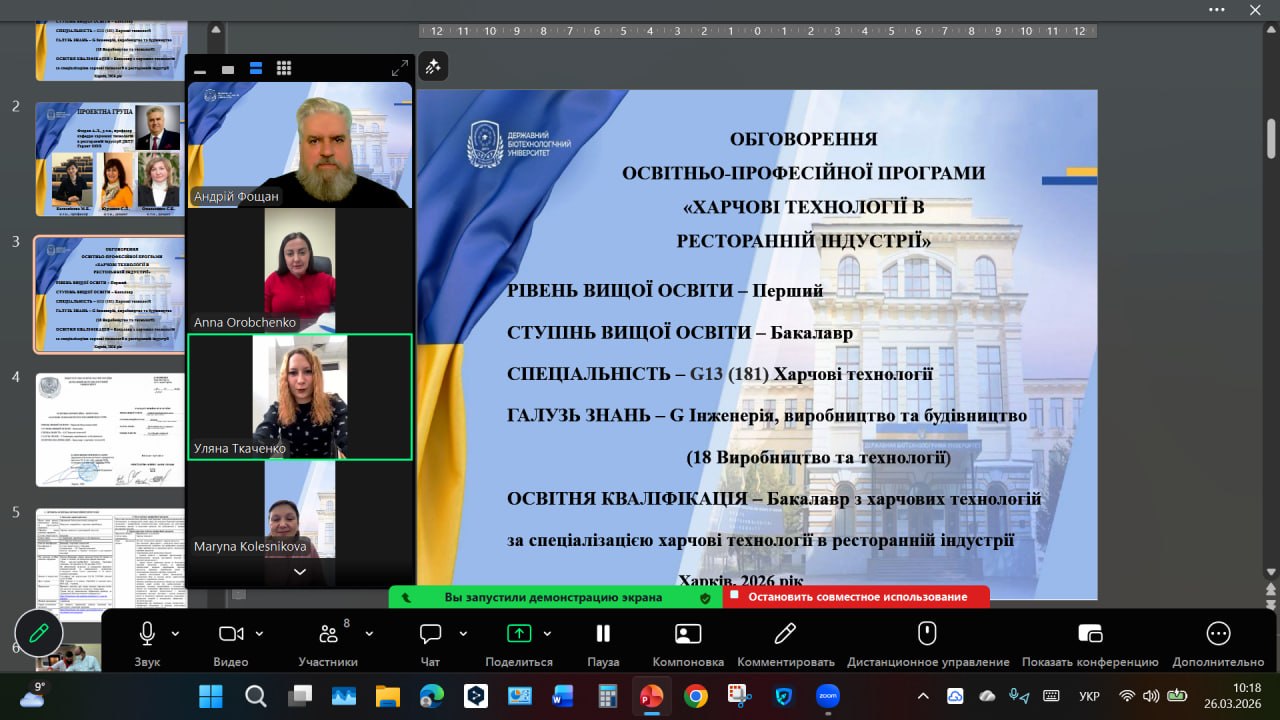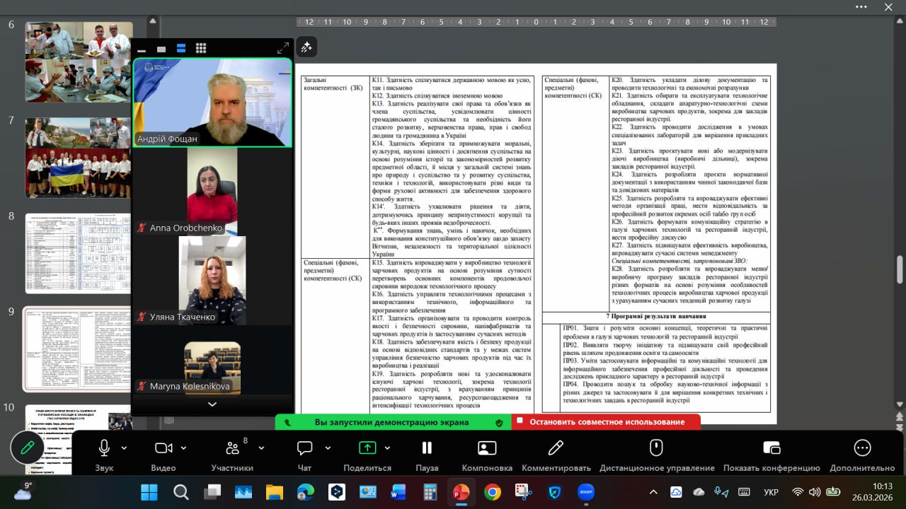 26 березня 2026 року відбулась нарада групи з удосконалення освітньо-професійної програми (ОПП) «Харчові технології в ресторанній індустрії» спеціальності G13 «Харчові технології» першого (освітньо-професійного) рівня вищої освіти (ступінь бакалавр), щодо актуалізації ОПП, її адаптації до сучасних вимог ресторанної індустрії та підвищення конкурентоспроможність випускників.