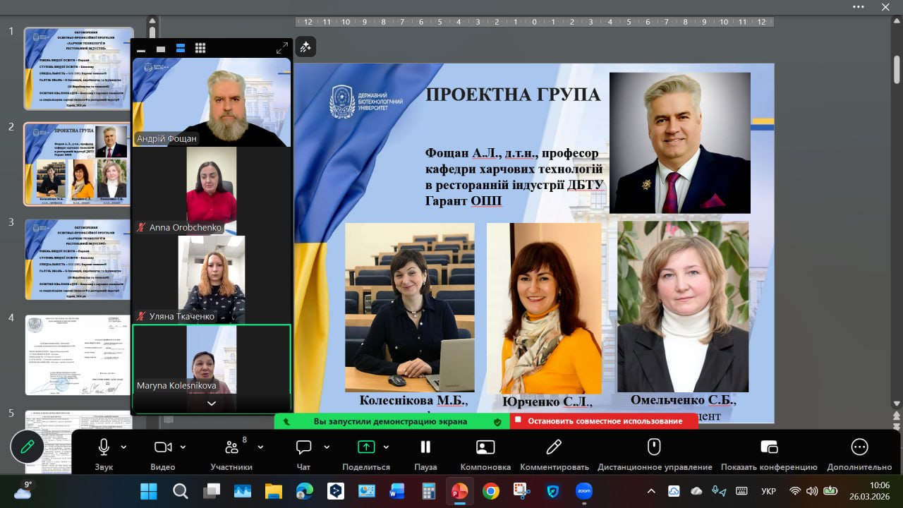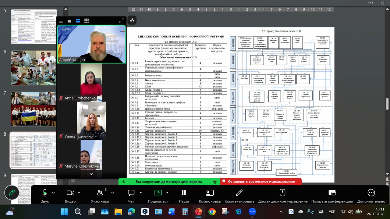 Гарант програми представив загальну характеристику ОПП, її мету, структуру та особливості. Було зазначено, що програма передбачає 240 кредитів та триває 3 роки 10 місяців. Мета програми: підготувати сучасних конкурентоспроможних фахівців, які розуміють технологічні процеси у виробництві та ресторанному бізнесі, вміють управляти якістю і безпечністю харчових продуктів, здатні проєктувати нові виробництва та впроваджувати інноваційні технології у ресторанну індустрію.