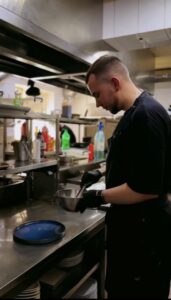 Здобувач Тарандюк Олександр у рамках дисципліни «Технологія харчової продукції закладів ресторанної індустрії» демонструє відпрацювання страви «Стейк з яловичого язика з картоплею».