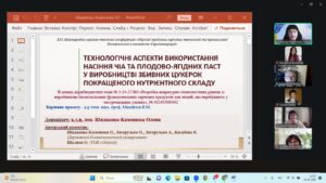 У рамках роботи конференції доцент кафедри технології хлібопродуктів і кондитерських виробів Шидакова-Каменюка О. Г. представила доповідь на тему: «Технологічні аспекти використання насіння чіа та плодово-ягідних паст у виробництві збивних цукерок покращеного нутрієнтного складу».