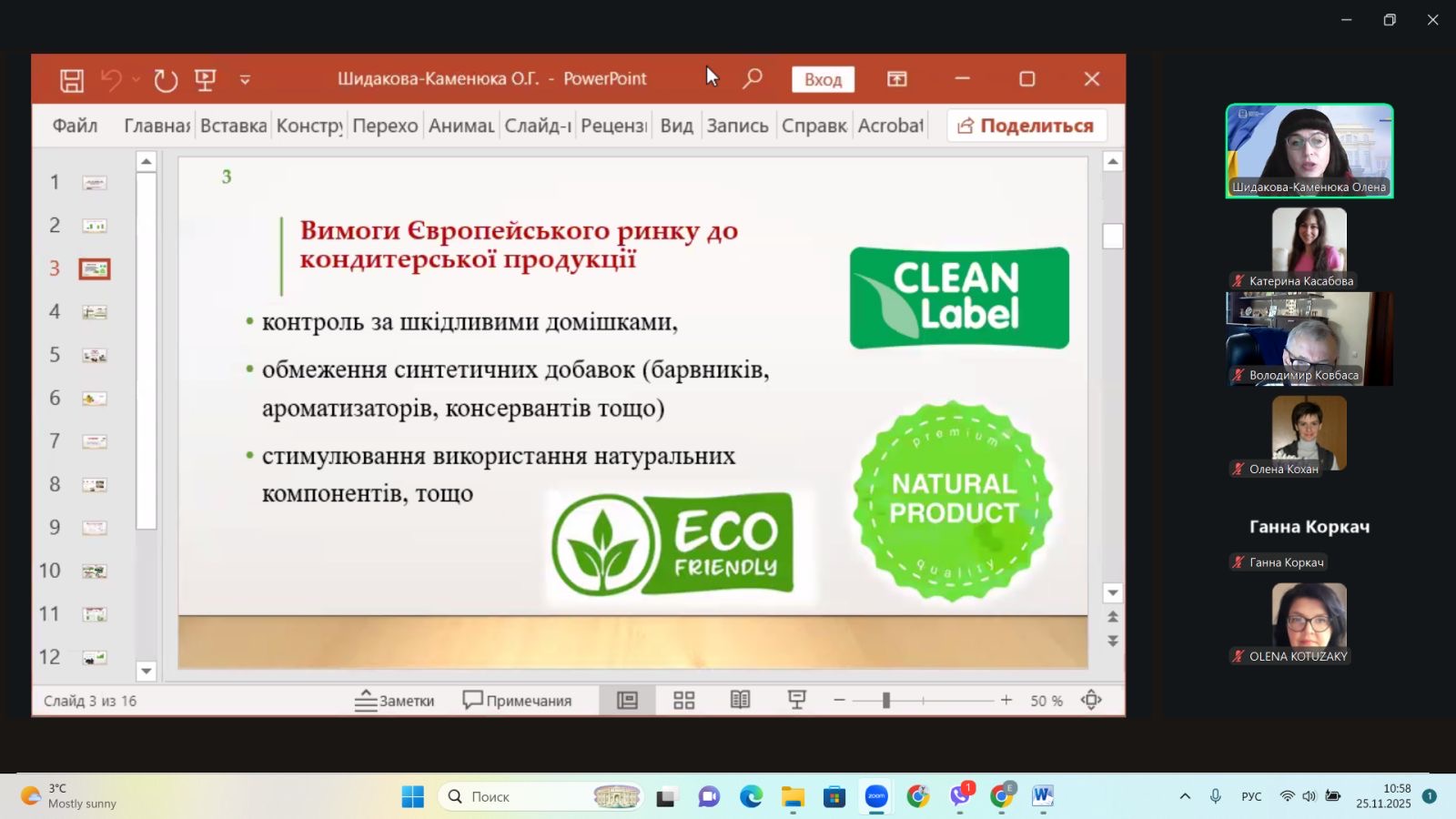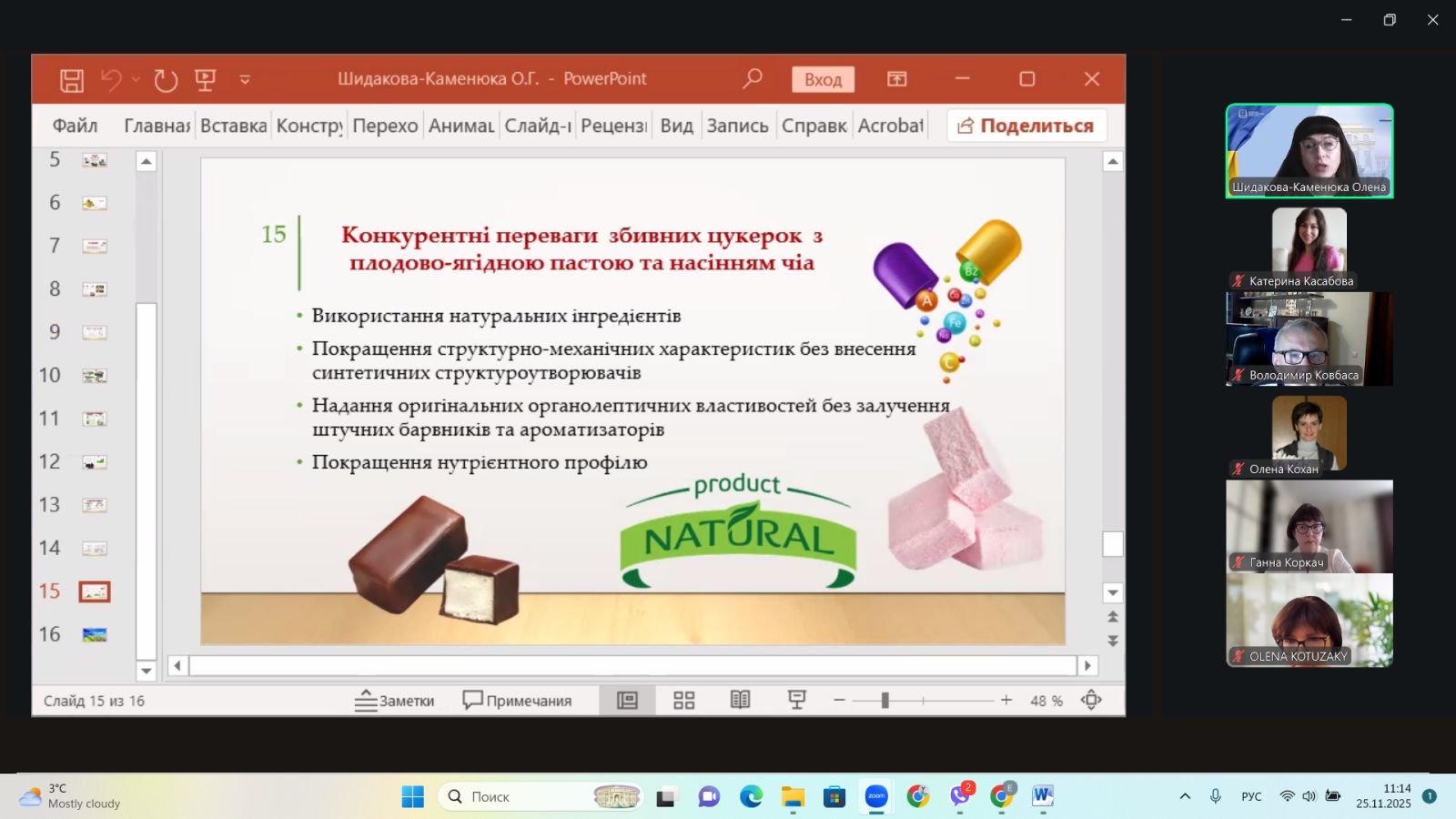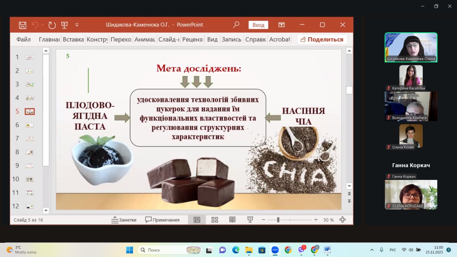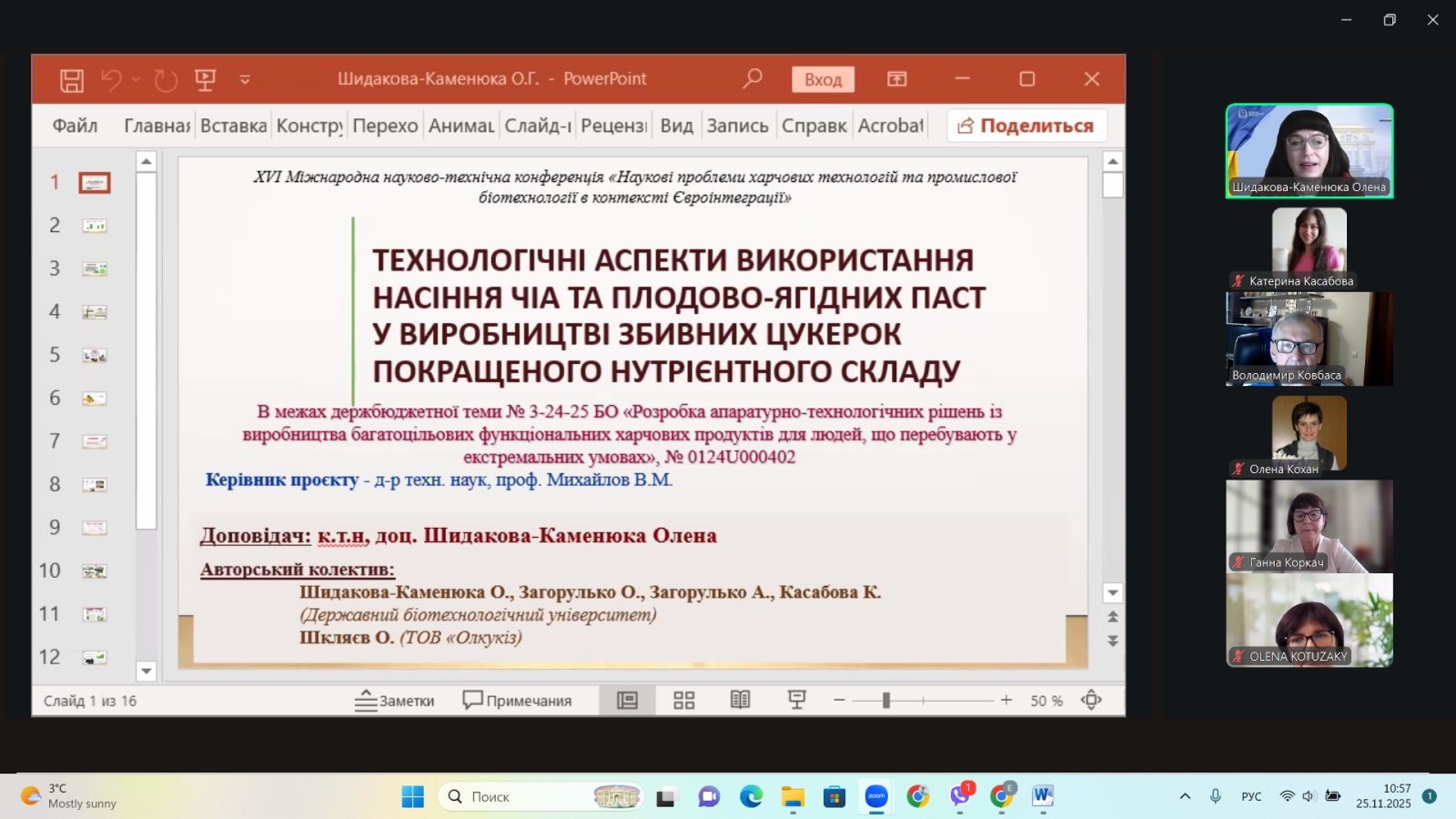 У рамках роботи конференції доцент кафедри технології хлібопродуктів і кондитерських виробів Шидакова-Каменюка О. Г. представила доповідь на тему: «Технологічні аспекти використання насіння чіа та плодово-ягідних паст у виробництві збивних цукерок покращеного нутрієнтного складу».