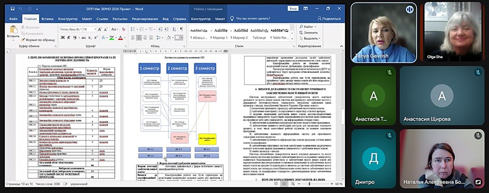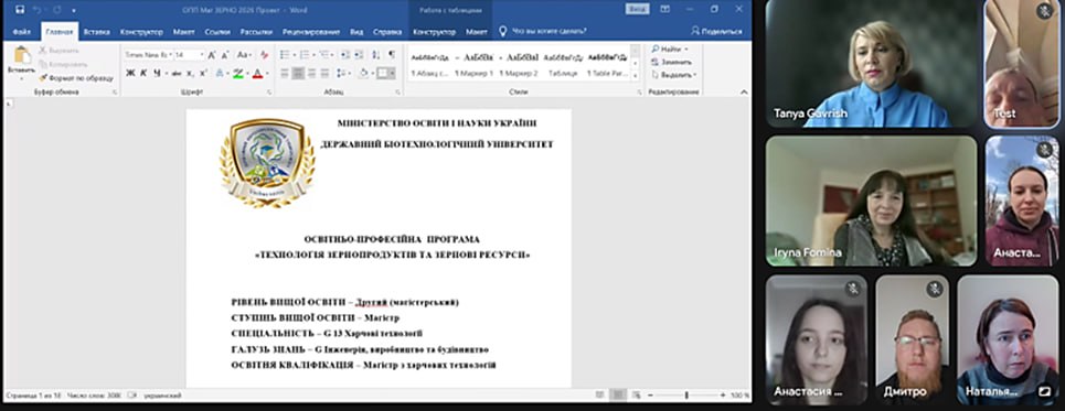 17.03.2026 р відбулося засідання групи удосконалення ОП «Технології зернопродуктів та зернові ресурси» другого рівня вищої освіти (магістр). До складу групи увійшли гарант ОП д.т.н., проф. Шаніна О.М., к.т.н., доц. Гавриш Т.В., к.т.н., доц. Фоміна І.М., а також стейкхолдери – Титаренко А.П. директор з якості зерна ТОВ «АР Бориспіль», Мезенцев В.О., головний інженер ПрАТ «Харківський комбікормовий завод» і представники здобувачів – Щирова А.О. та Смирнов Д.С.