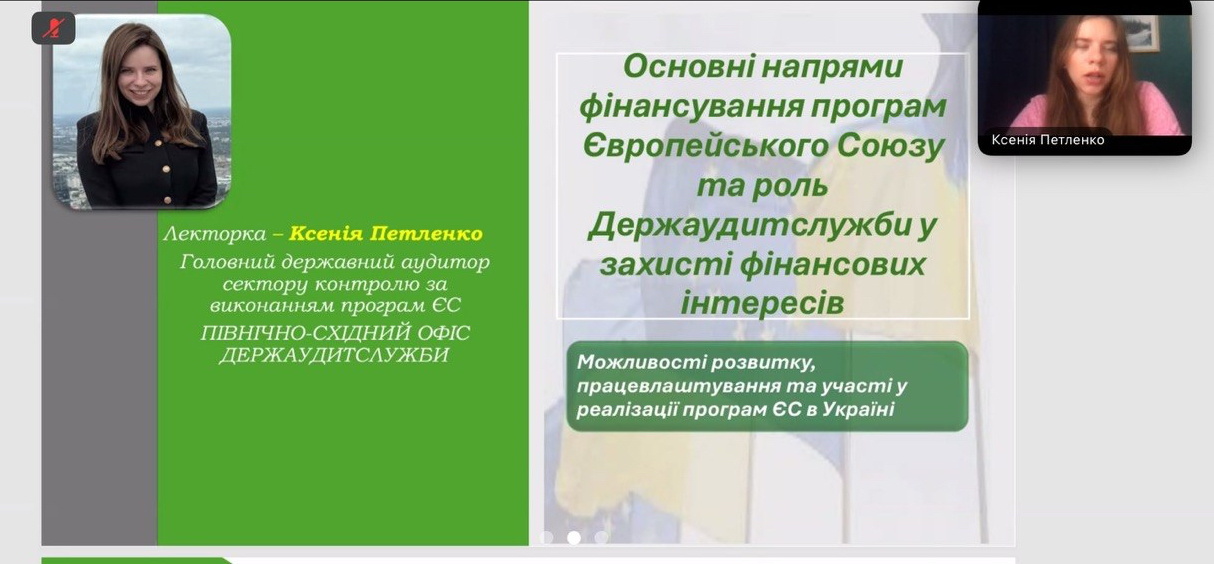 Спікером заходу виступила Ксенія Петленко – головний державний аудитор сектору контролю за виконанням програм ЄС Північно-східного офісу Держаудитслужби України, випускниця нашого університету.