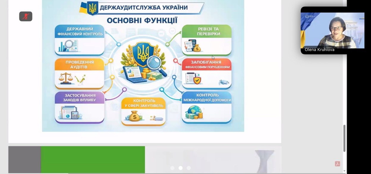 У ході лекції особливу увагу було приділено діяльності Державної аудиторської служби України як ключового інституційного органу фінансового контролю, який забезпечує прозорість, ефективність і законність використання коштів, зокрема у межах програм Європейського Союзу.